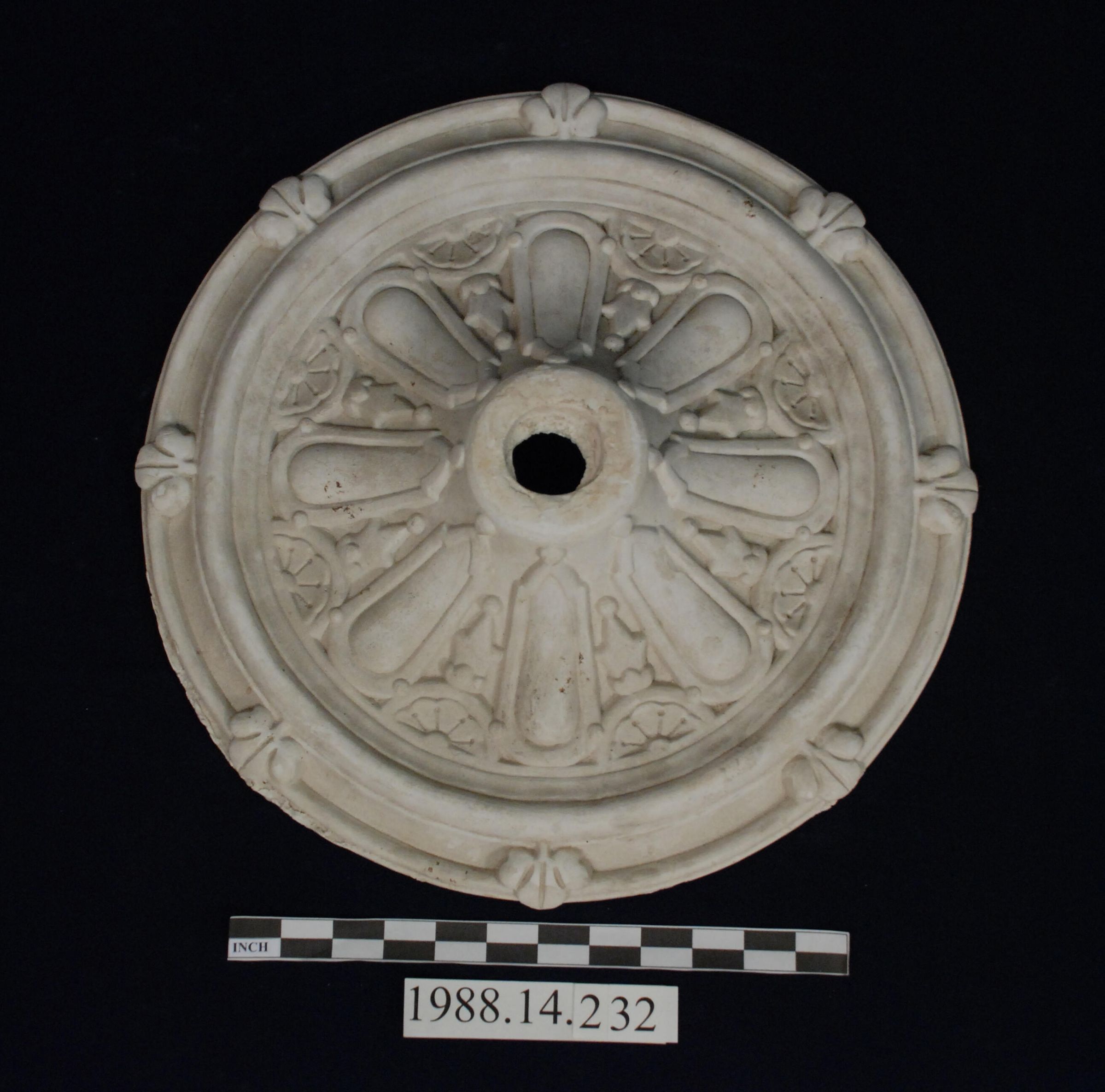 Reproduction molded plaster. Circular medallion. Leaf motif around perimeter. Center has rosette with geometric motif.