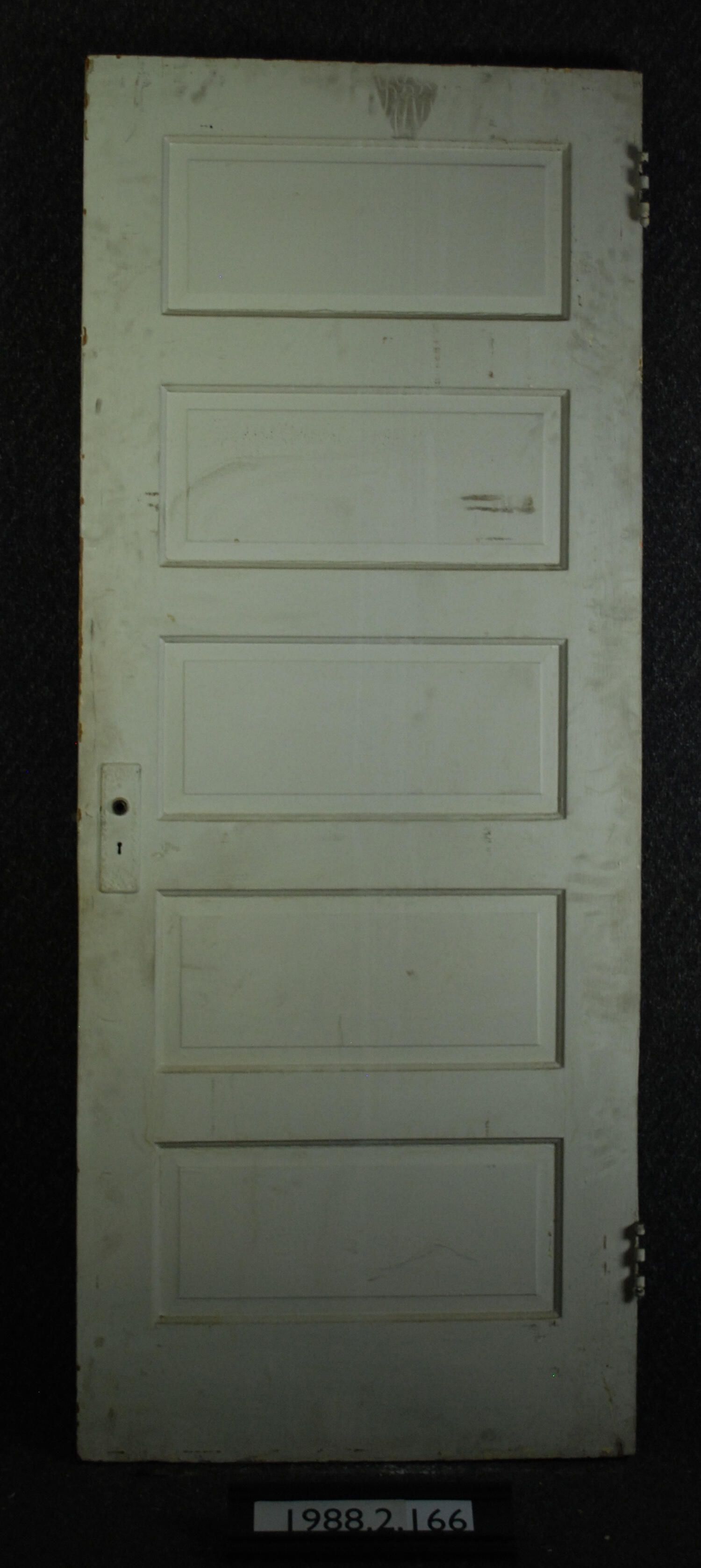 Five--panel door. Has mortise lock, two back plates, and two hinge leaves. Painted off-white /cream colored on both sides.