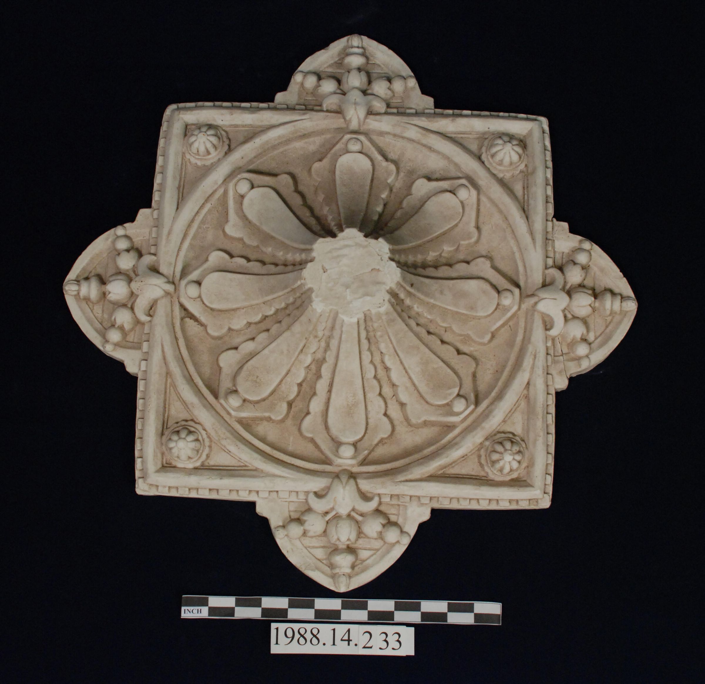 Reproduction molded plaster. Square medallion with circular convex rosette at center. Appendage at each side of square. Floral bud and leaf motif. Small rosette at each corner of square. Break with old repair at appendage.