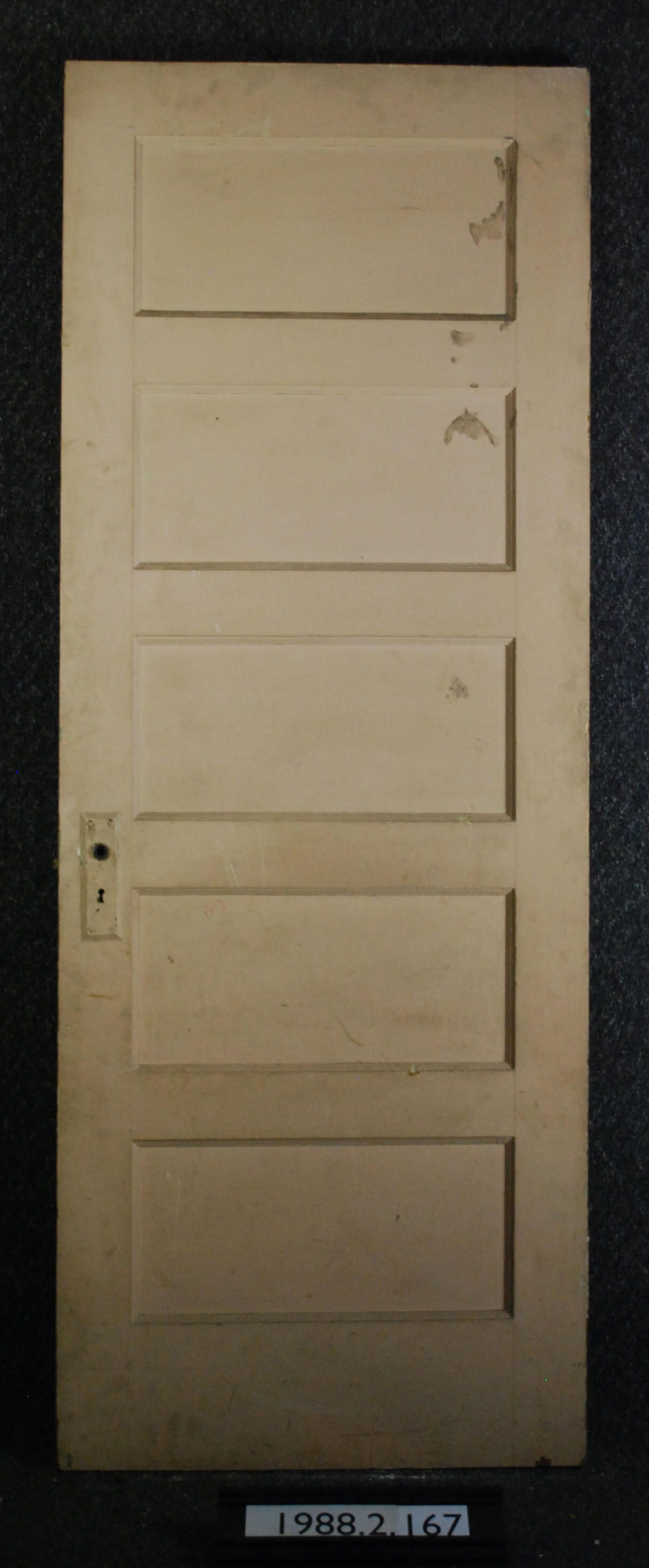 Five--panel door. Has mortise lock, two back plates, one leaf hinge, and one complete hinge. Painted beige on one side and off-white on the other..