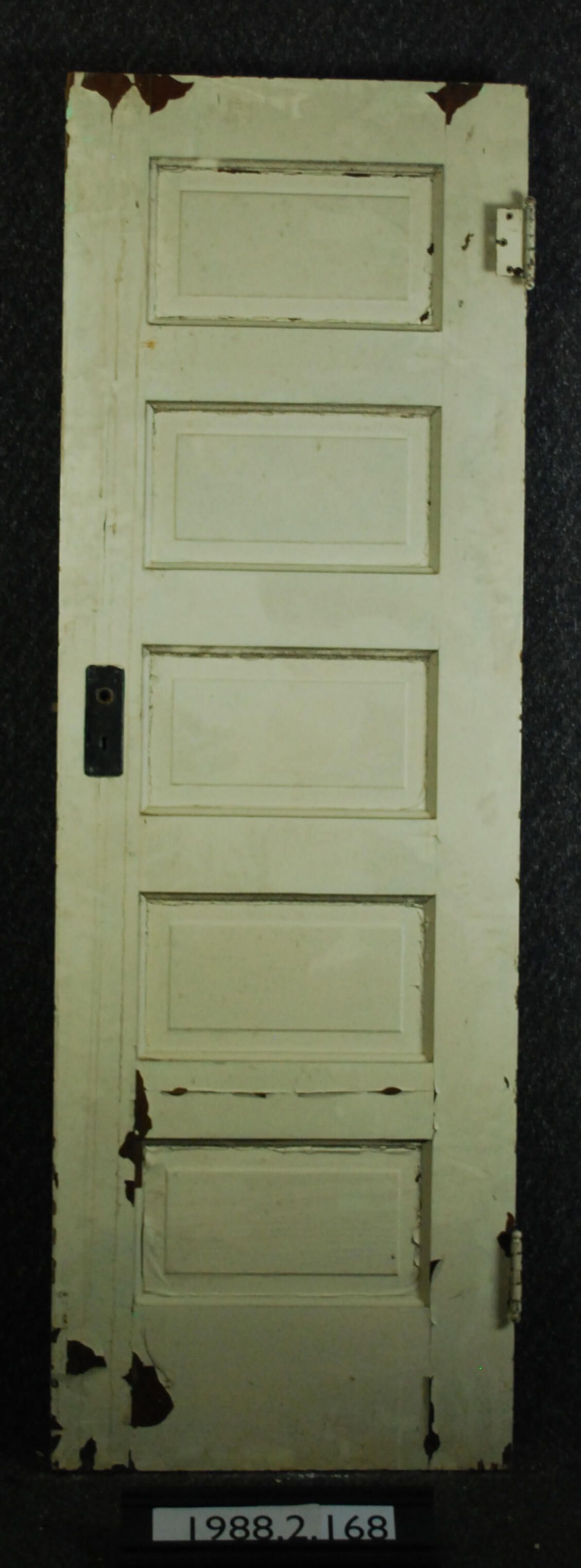 Five--panel interior door (probably closet or bathroom door). Some water damage. Has mortise lock, two back plates, and two complete hinges. Painted beige on one side and off-white on the other..