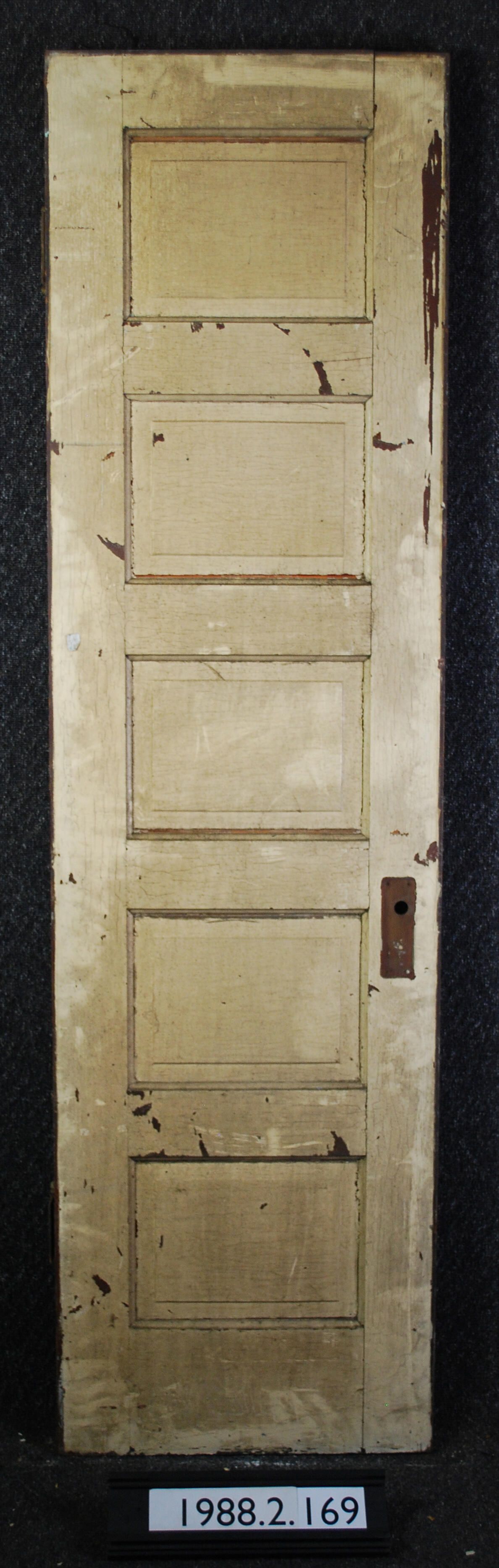 Five--panel interior closet door. Has two hinges. All other hardware is missing. Painted cream / yellow on both sides...