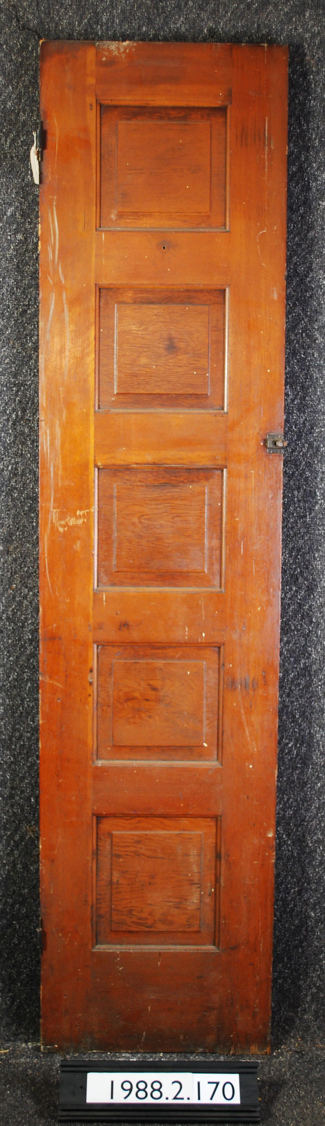 Interior closet / cupboard door with spring latch and two hinge leaves. Varnished on both sides. Inscriptions or Markings: Manufacturer: Place of Manufacturer: Design Motifs: Style: Finish: Varnished on both sides