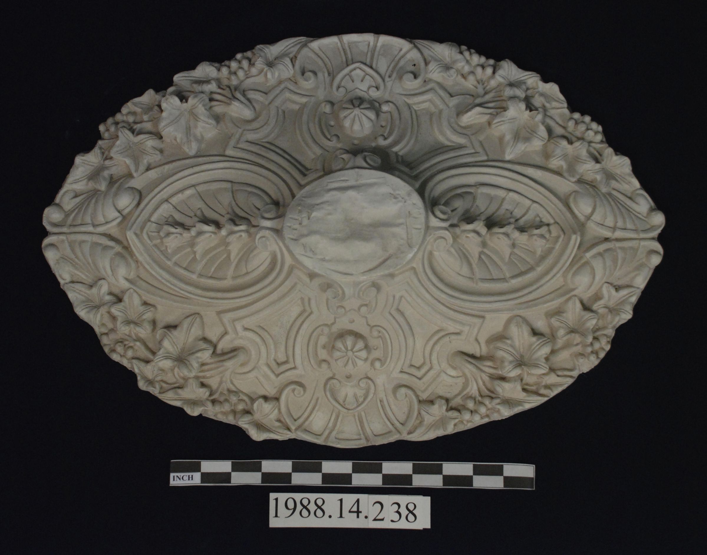 Reproduction molded oval medallion. Features stylized leaf , intertwined vines and floral motifs with rosettes. Also features scrolls and recessed panels. Overall design is symetrical. Painted white.