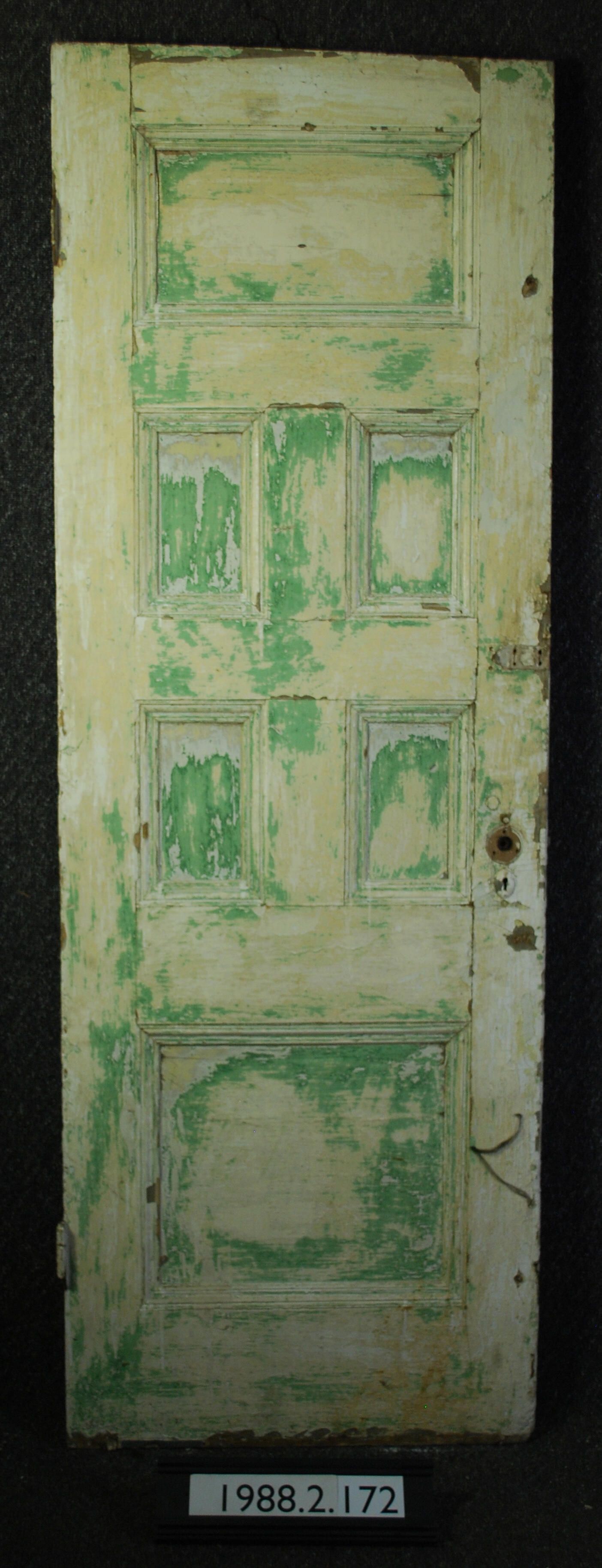 Six panel exterior door with applied moldings. Has mortise lock, one back plate, and one keyhole escutcheon. Also has two hinge leaves. Inscriptions or Markings: Manufacturer: Place of Manufacturer: Design Motifs: Style: Finish: Painted