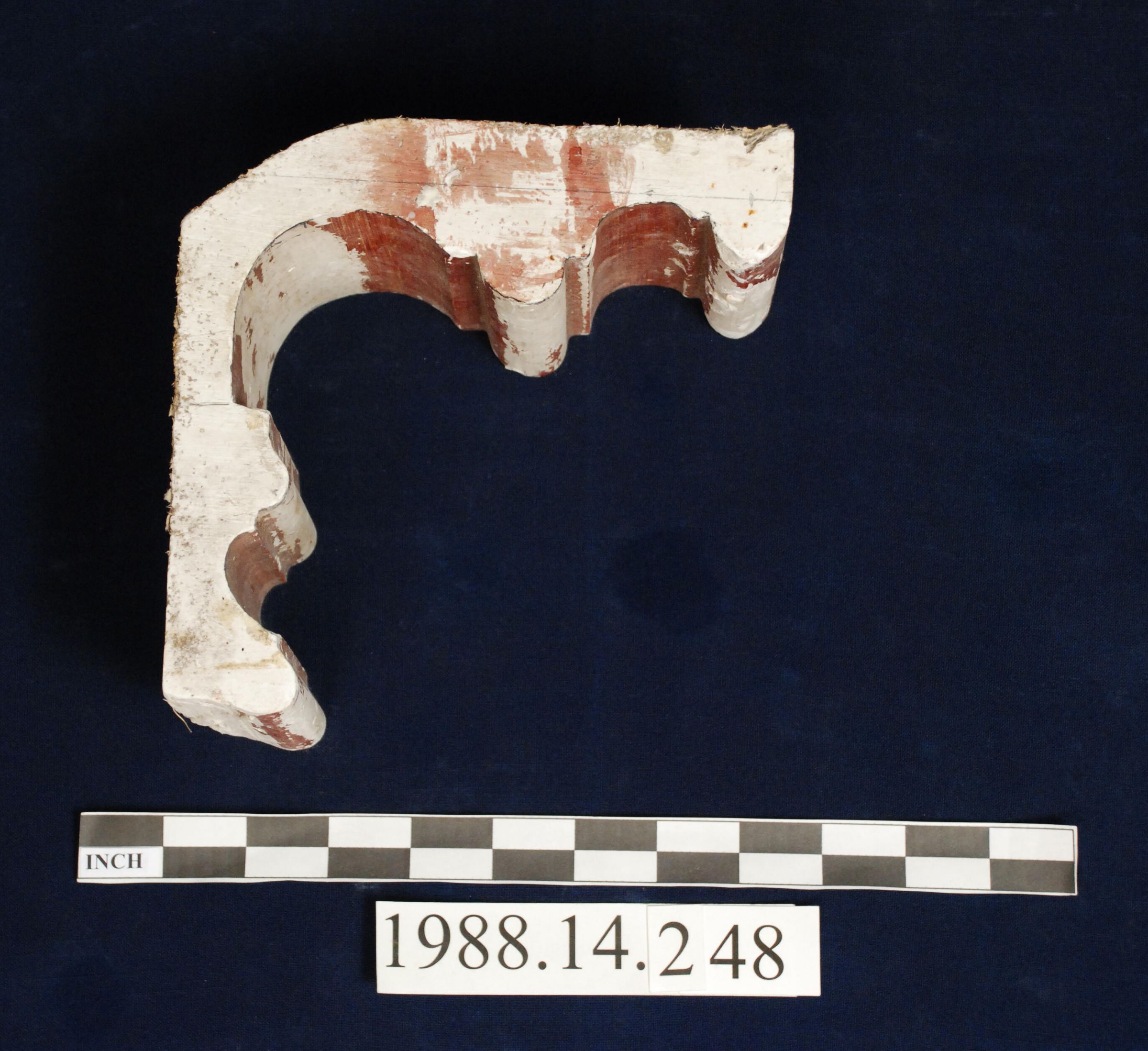 Reproduction molded plaster. "L" shaped section of molding with compound profiles including cove. Partially painted. Newspaper attached on back.