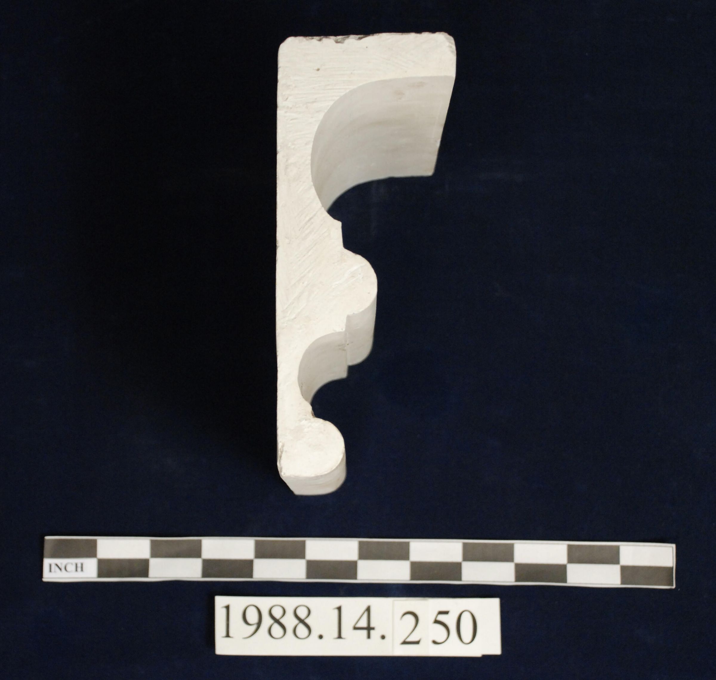 Reproduction molded plaster. Section of molding with compound profiles, including cove. Saw-cut end.
