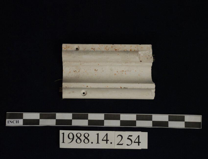 Reproduction molded plaster. Section of molding with compound profiles, including cove. One end has clean break. Has two drilled holes re-inforced with fiberglass mesh.