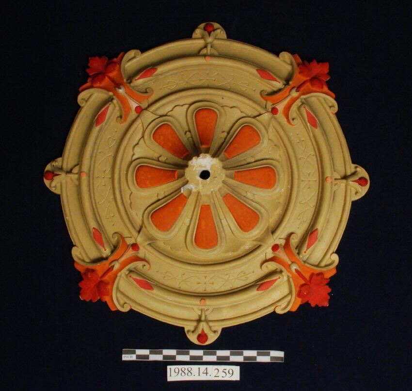 Reproduction molded plaster. Circular ceiling medallion. Has central convex rosette with hole. Has series of leaf / scroll and floral bud appendages around perimeter. Aesthetic geometric