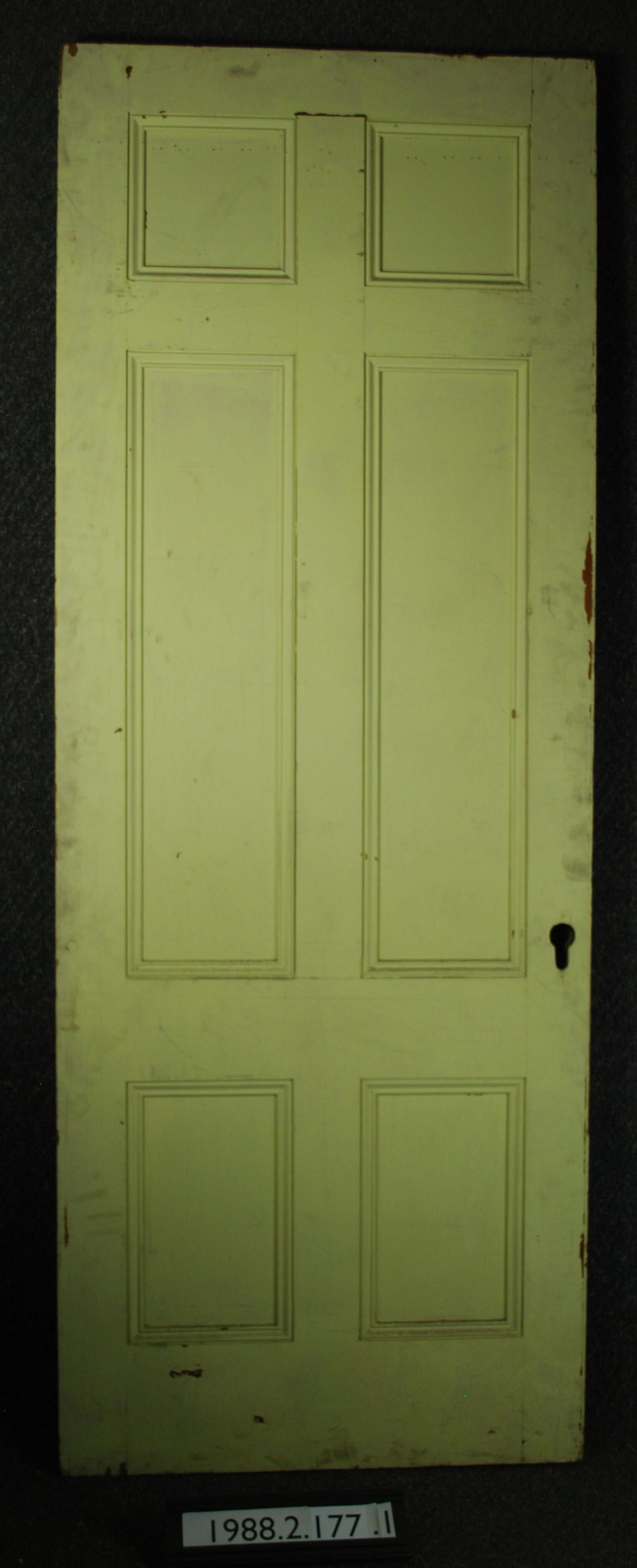 Six-panel interior sliding pocket door.. Applied moldings. All hardware is missing. Painted yellow on both sides. Inscriptions or Markings: Manufacturer: Place of Manufacturer: Design Motifs: Style: Finish: Painted Yellow on both sides