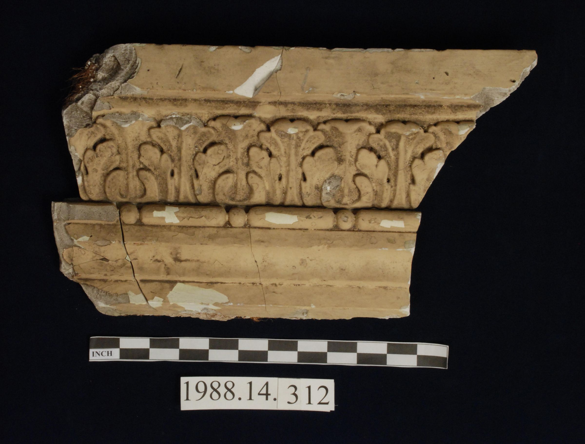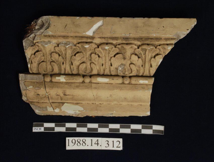 Historic plaster cornice fragment. Acanthus motif. Bead and Barrel. Cove. Painted beige. Reinforaced with plant fibre.