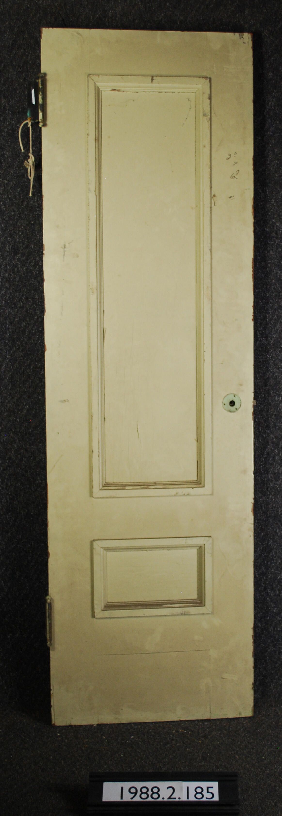 Two-panel interior door. Applied bolection moldings on both sides. Panels are plywood (seem to be original). Has two complete hinges and spring latch. Has detached strike plate. One of a pair. Painted lime green on both sides.