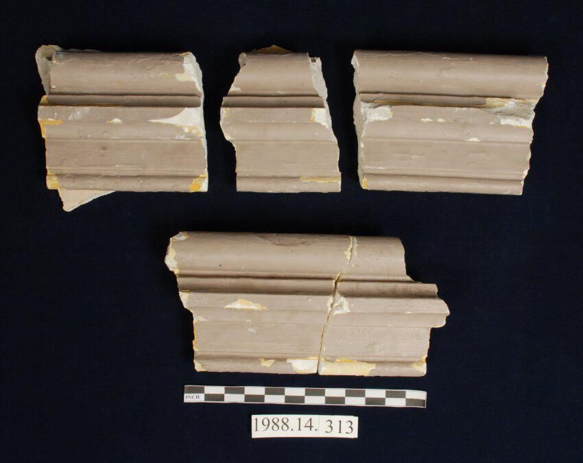 Historic plaster (molding or cornice) fragments, compound molding profile including convex cylindrical and cove. Painted brown. Mortar backings. Some pieces match at break joints.