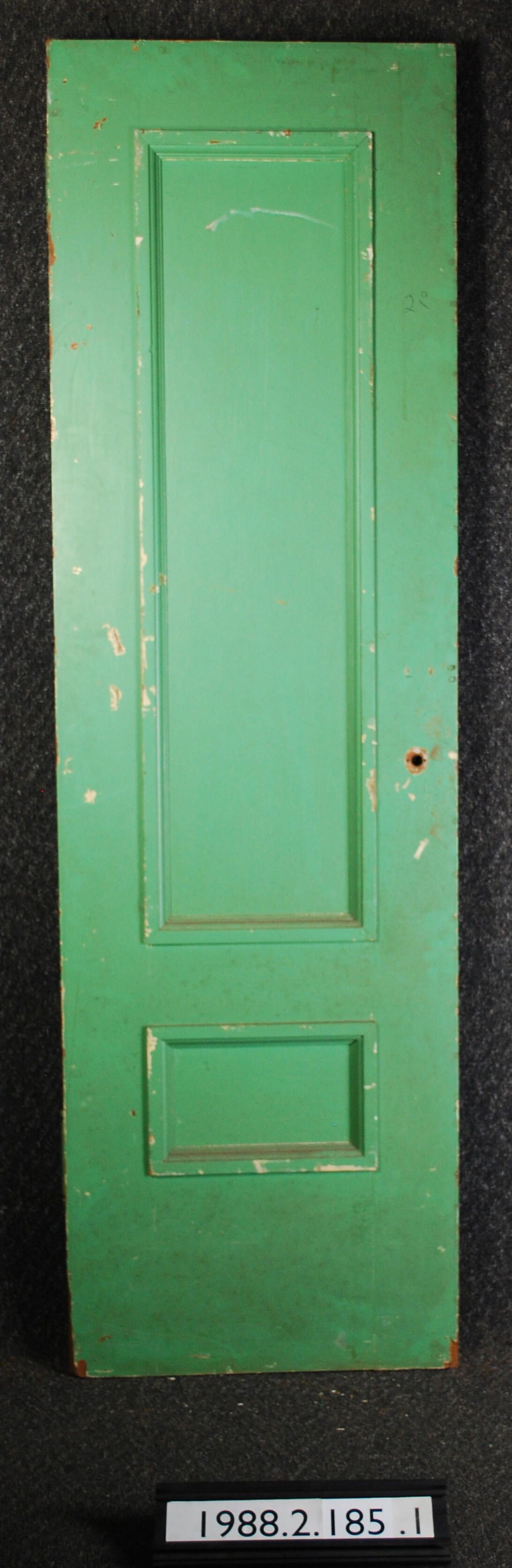 Two-panel interior door. Applied bolection moldings on both sides. Spring latch missing. Has two hinges. Plywood panels. One of a pair. Painted green on both sides.