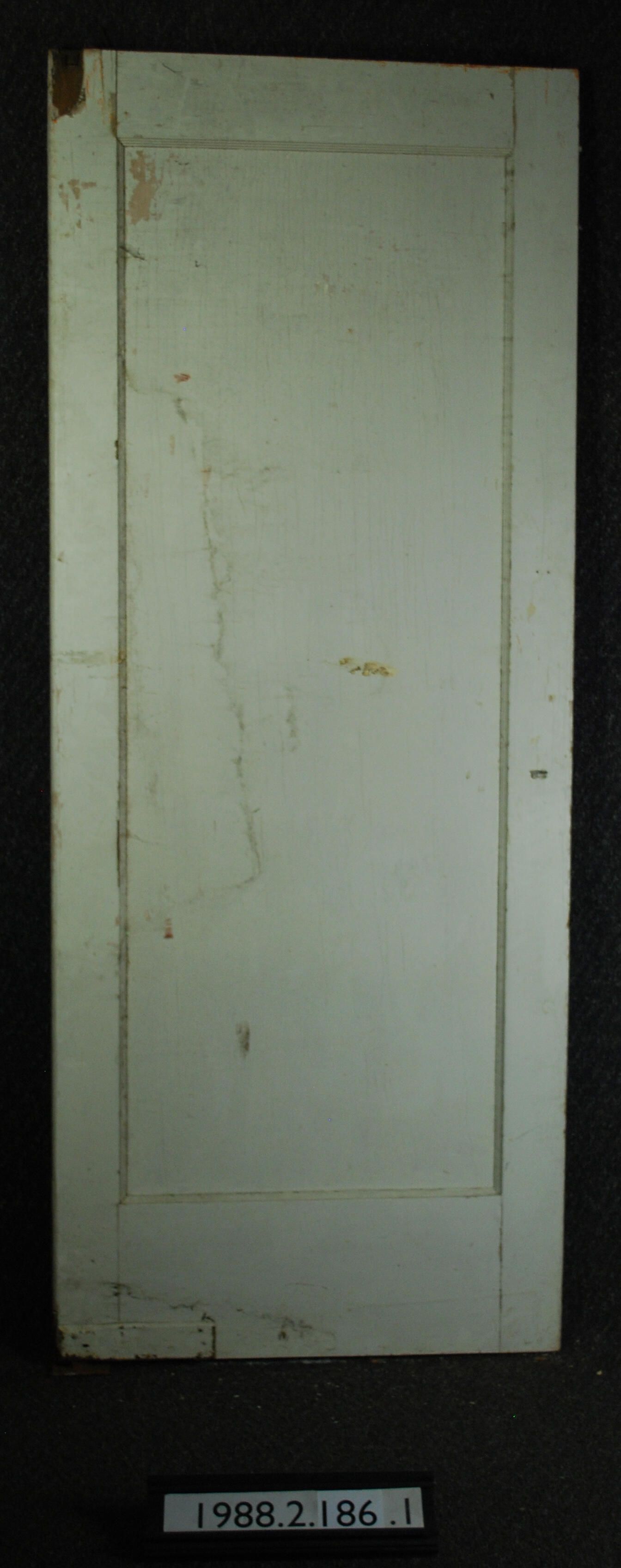 Single plywood panel interior door. Spring-latched hinge at bottom. Hardware for hinge at top. Painted pink with off-white over top.