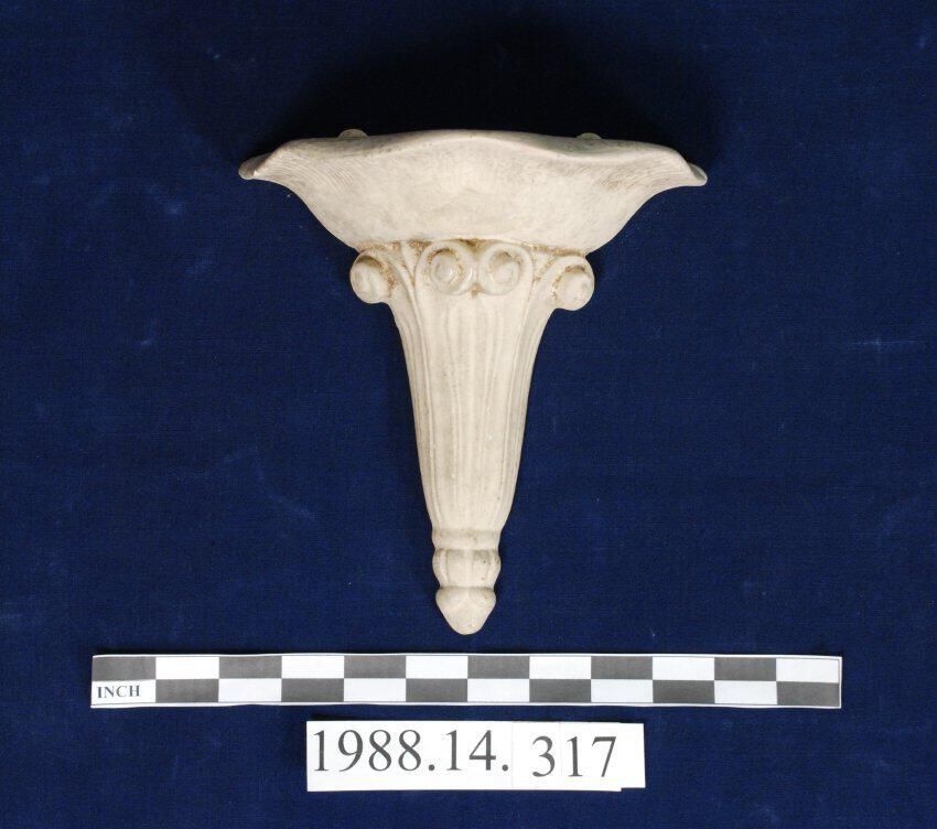 Historic semi-circular shelf with scalloped rim. Scrolled organic drop. Two iron loops on back.