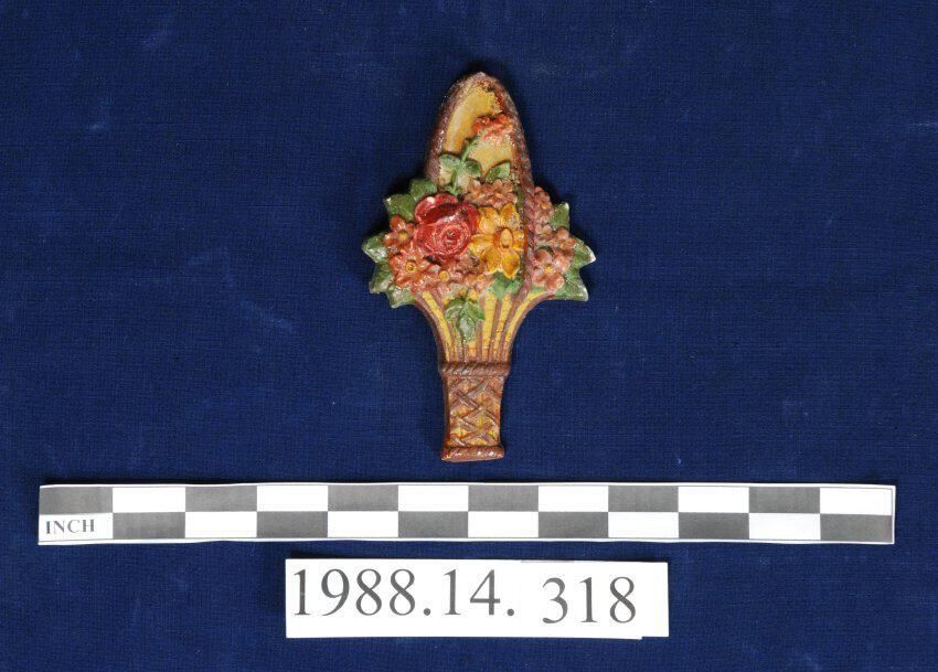 Historic plaster wall ornament. Basket of flowers motif. Poly chrome decorated.