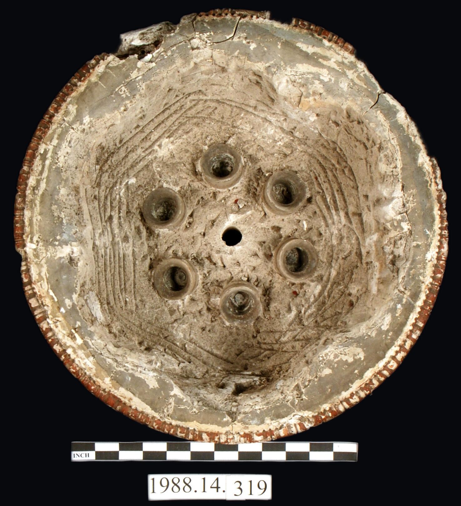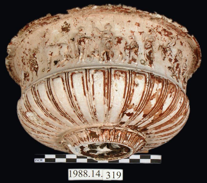 Molded plaster. Reinforced with plant fibre. Historic Greco-Roman Revival urn with frieze around sides depicting human figures / horses. Reddish paint remnants. Six porcelain electrical sockets and electrical wires cast in place.