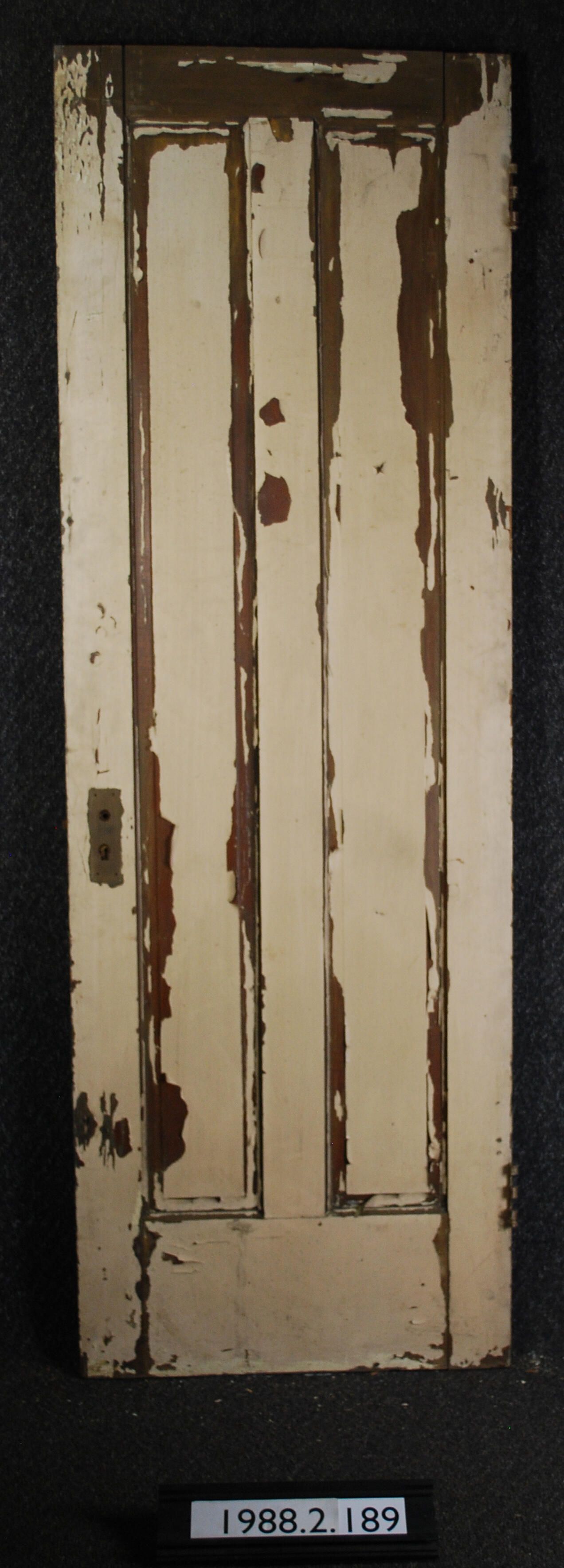 Two-panel (vertical) door. Has mortise lock, and hinge leaves. All other hardware missing. Painted beige on both sides. Inscriptions or Markings: Manufacturer: Place of Manufacturer: Design Motifs: Style: Finish: Painted Beige on both sides