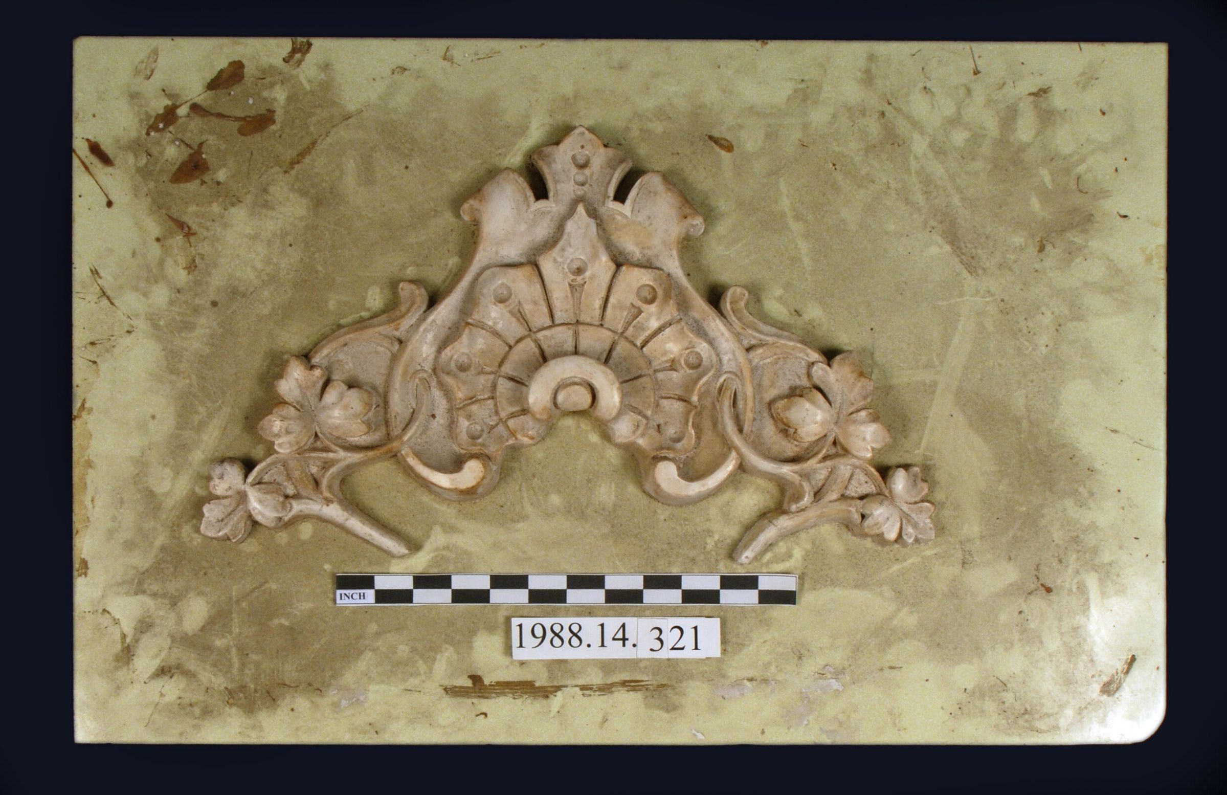 Historic plaster ceiling ornament. Scalloped shield center. Leaf and vine motif. Originally part of assemblage. Stripped (used later as templet to make mold). Mounted on modern pressed wood panel. (See 1988.14.320).