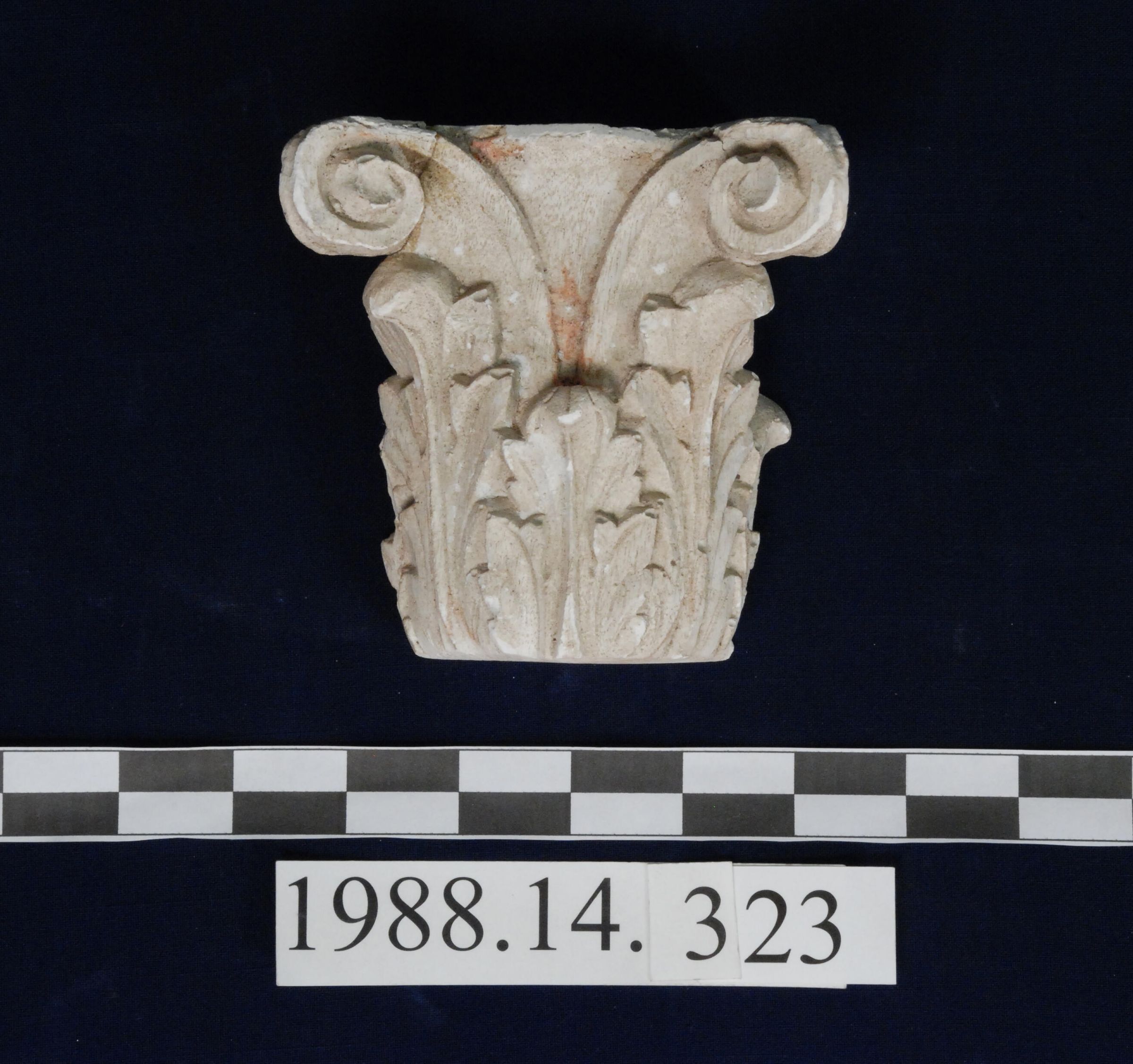 Reproduction molded plaster Corinthian Capital. Two volutes. Acanthus motif (half capital). See 1988.14.324.