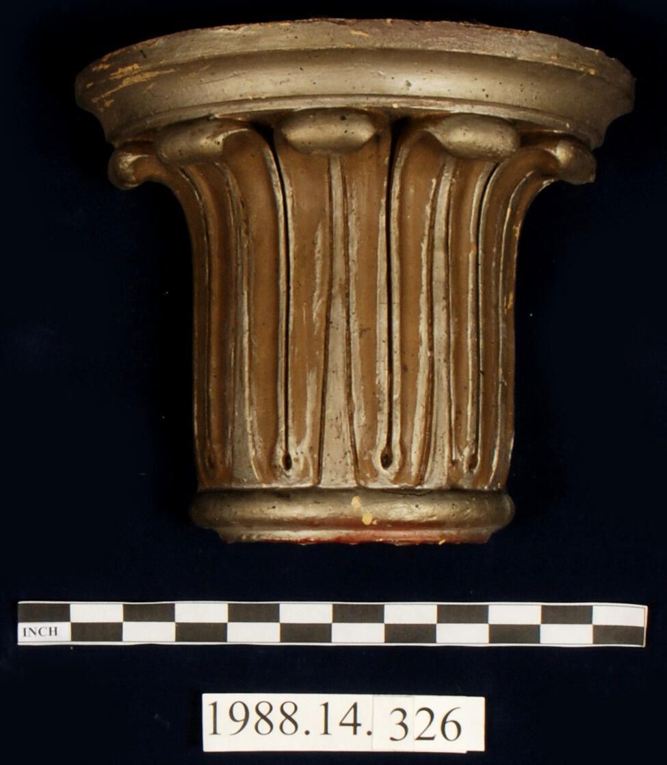 Historic plaster. Exotic style capital. Leaf motif. Antique silver painted. Half capital. Reinforced with plant fibre.