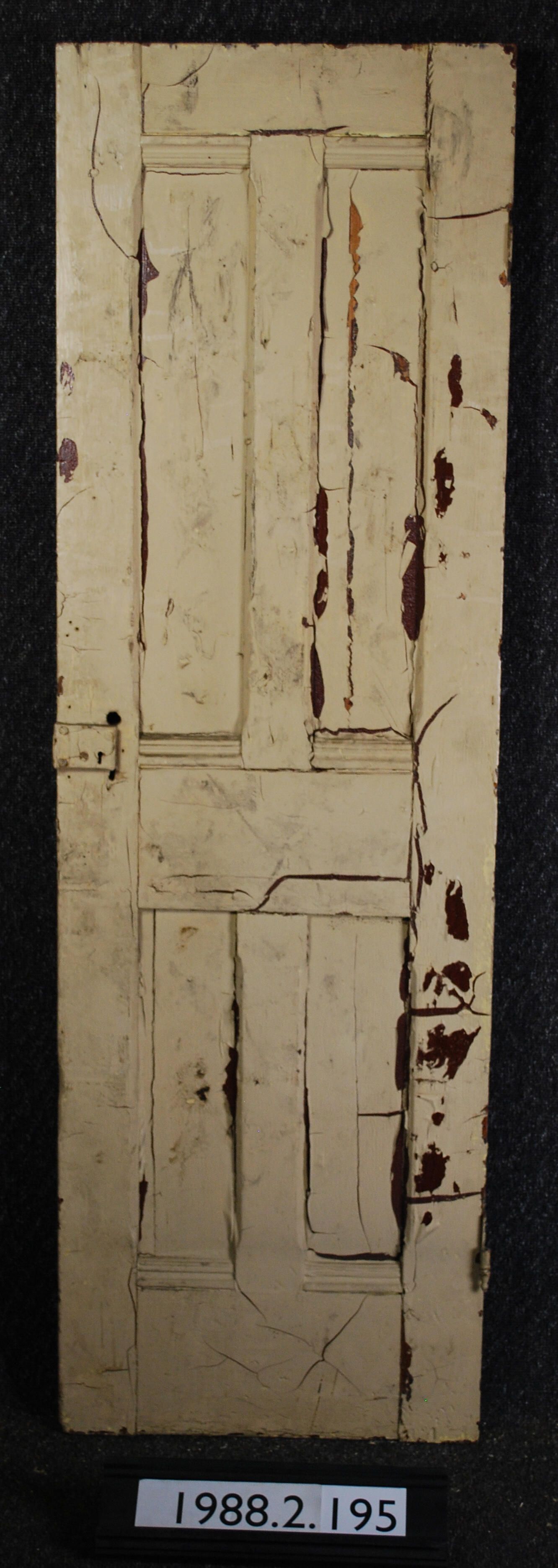 Four-panel interior closet door. Has applied moldings, rim lock, and two hinge leaves (one hinge leaf broken, incomplete). Painted dark cream on one side, and the other side is varnished.