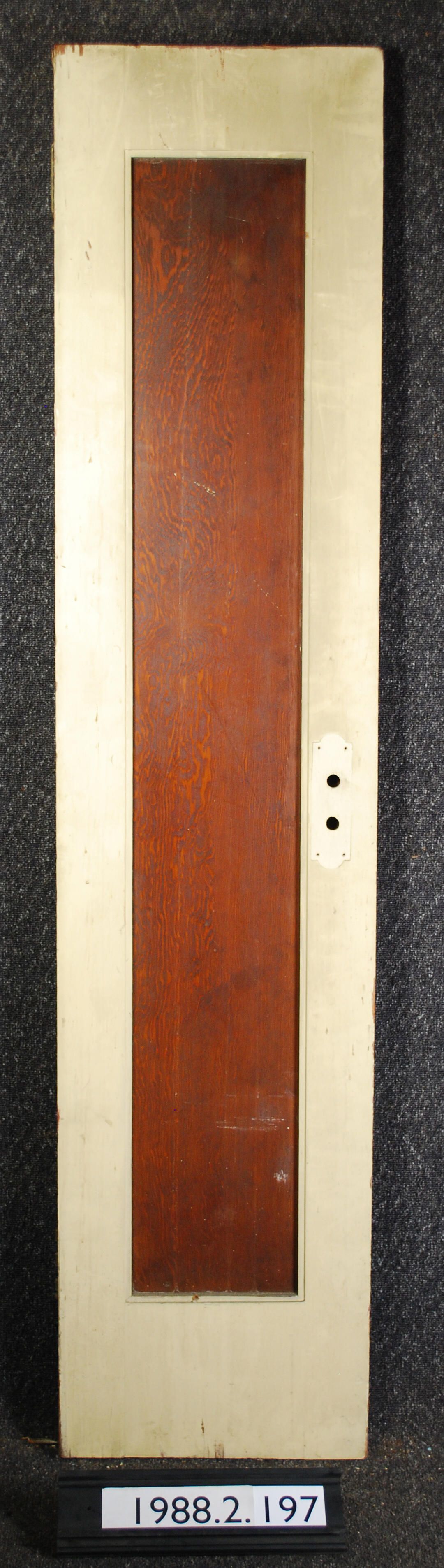 Single plywood panel interior closet door. Originally had mirrors - now missing. Has one complete hinge and one hinge leaf. All other hardware is missing. Central panel varnished, outer perimeter painted cream color.