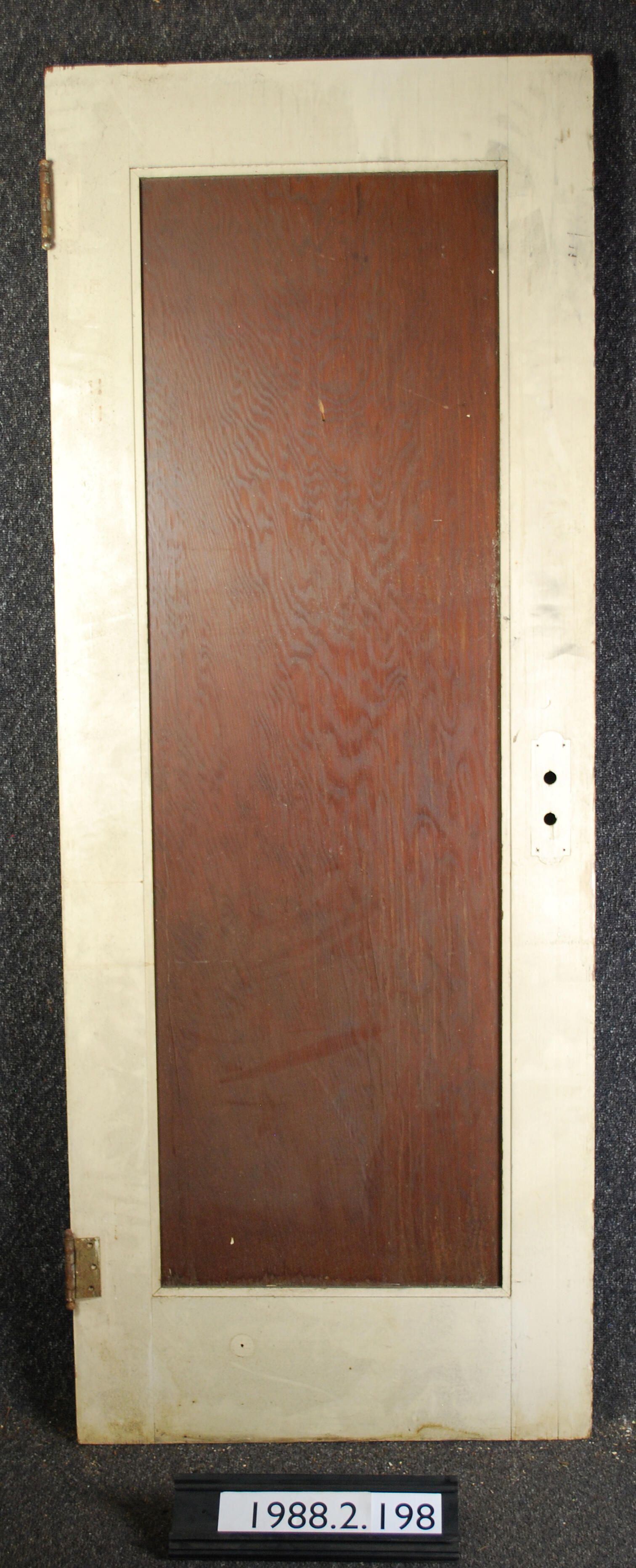 Single plywood panel interior door. Originally had mirrors - now missing. Has two complete hinges All other hardware is missing. Central panel varnished, outer perimeter painted cream color.