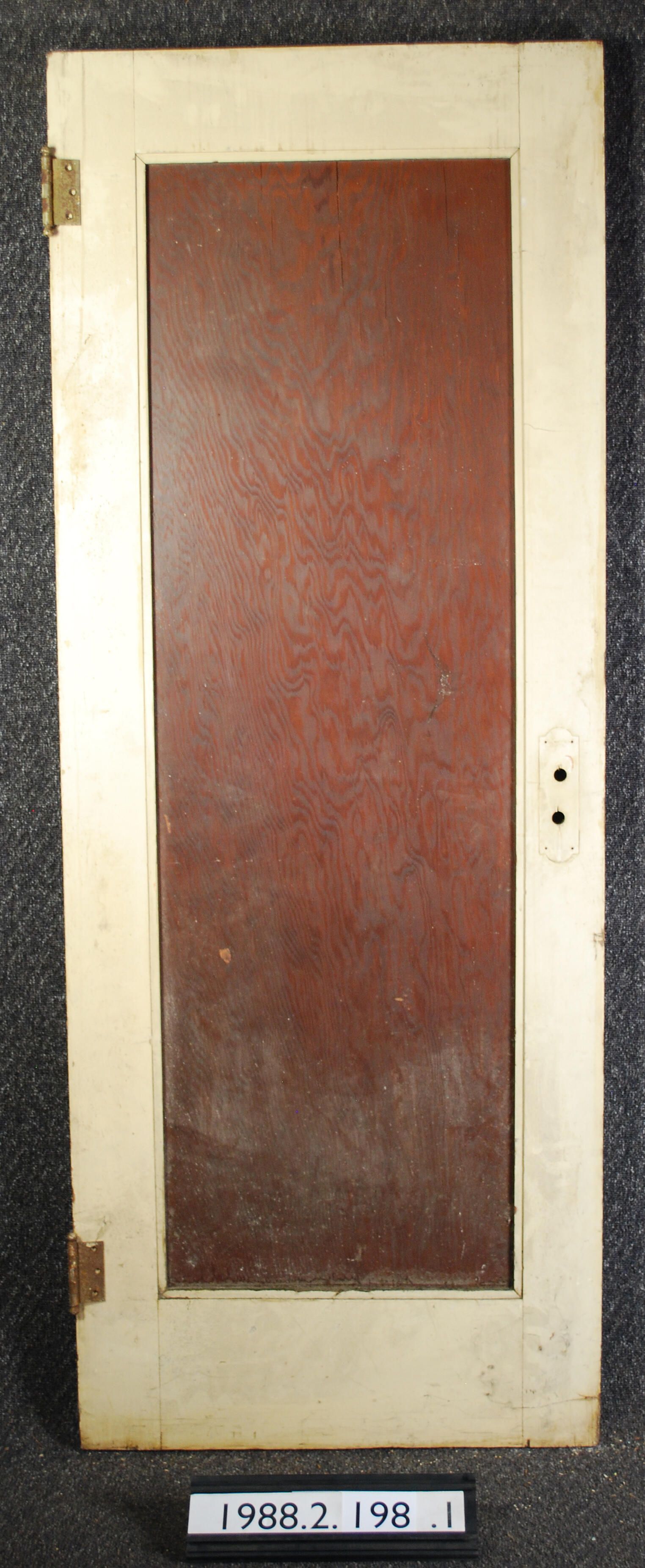 Single plywood panel interior door. Originally had mirrors on both sides - now missing. Has two hinges All other hardware is missing. Central panel varnished, outer perimeter painted cream color.