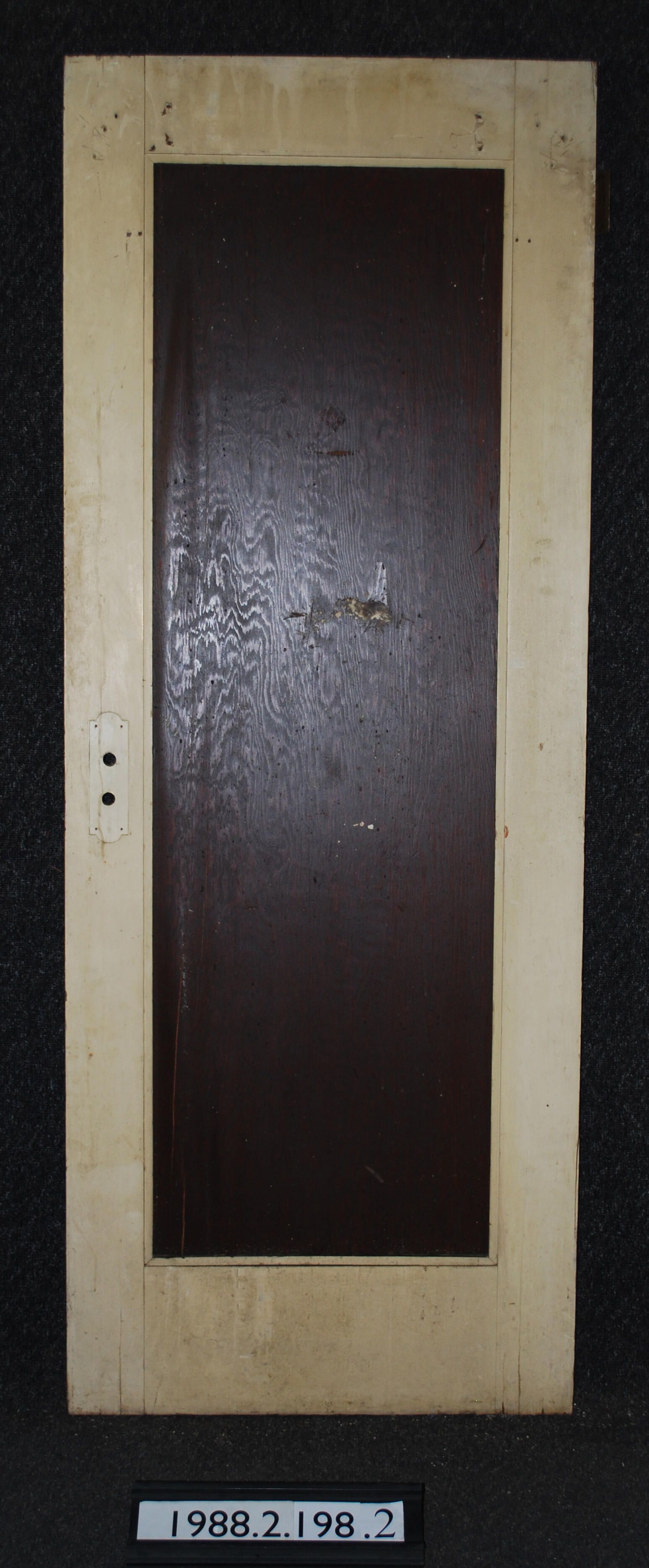 Single plywood panel interior door. Originally had mirrors on both sides - now missing. Has two hinges All other hardware is missing. Central panel varnished, outer perimeter painted cream color.
