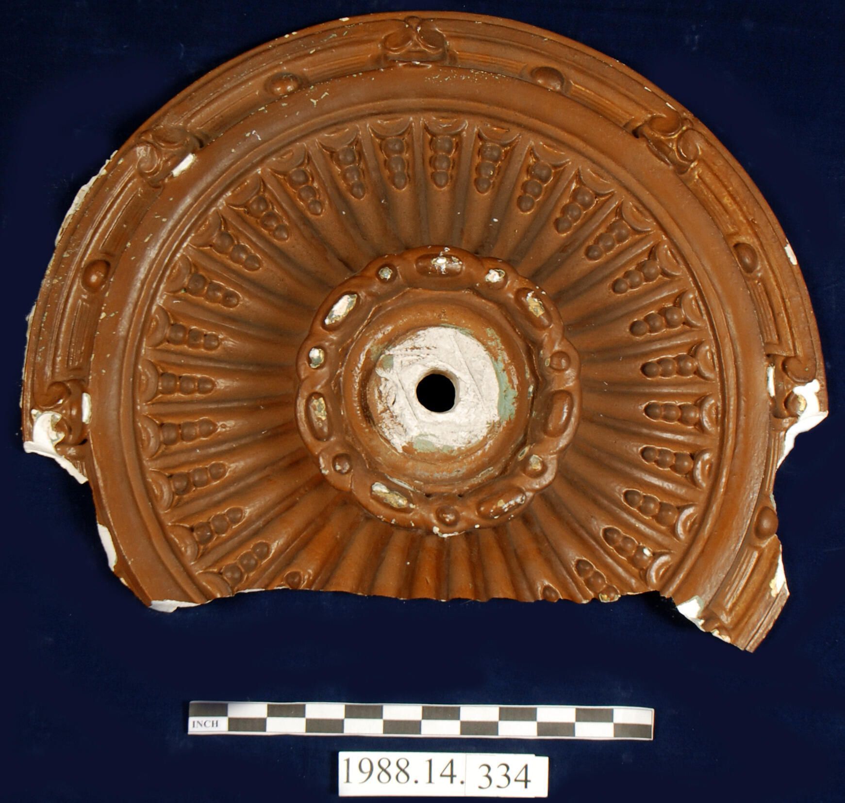Historic plaster circular ceiling medallion. Bead and lozenge with twist. Fluting with beads. Outer perimeter has alternating scroll and bead. Painted dark brown. One side of medallion is missing. Back has incised score marks.