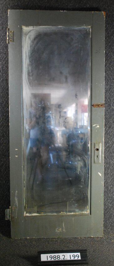 Single panel interior door. Plywood on one side and plate glass beveled mirror on the other side. Has mortise lock, two escutcheon plates, two hinges, and one sliding bolt. Originally the lock was mounted on one stile edge, but it had been moved to the other to change the swing of the door. Painted grey on both sides.