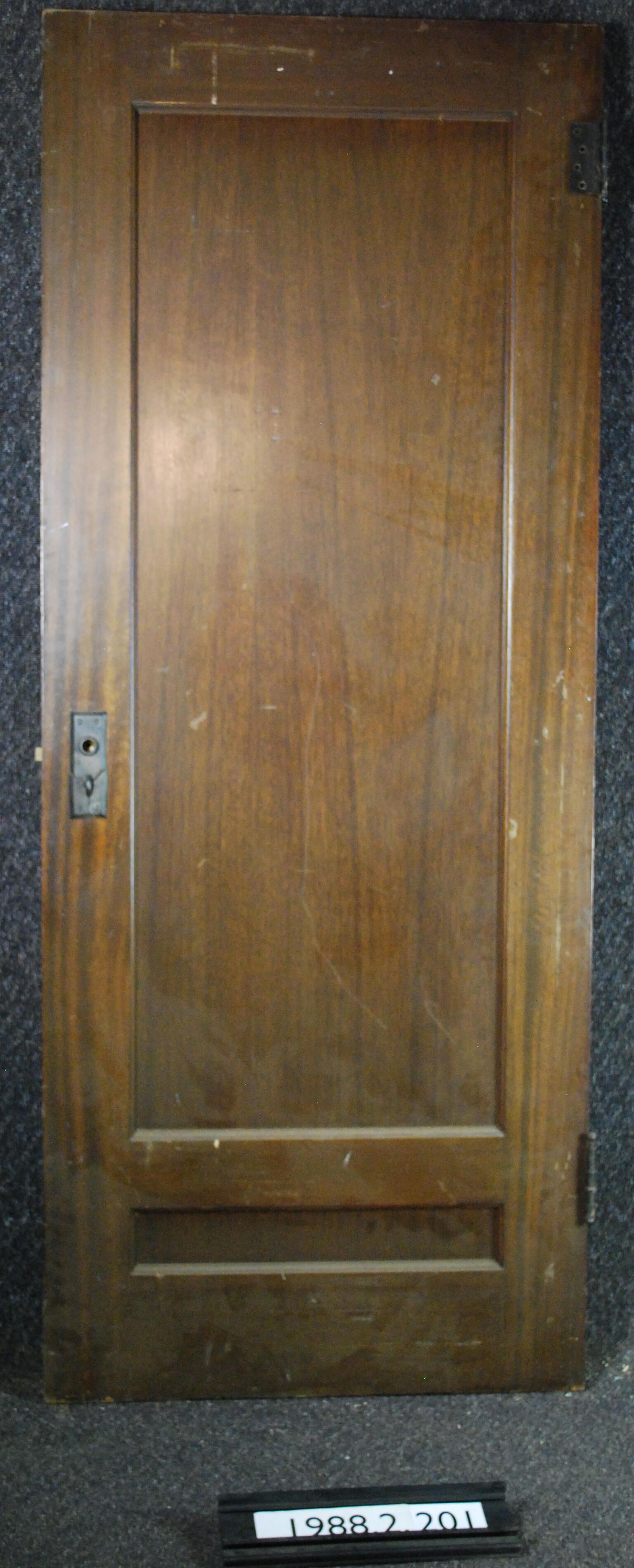 Two plywood panel interior (?) door. Made of mahogany. Has mortise lock, two cast iron escutcheon plates - broken) and two hinges. Painted. Inscriptions or Markings: Manufacturer: Place of Manufacturer: Design Motifs: Style: Finish: Painted