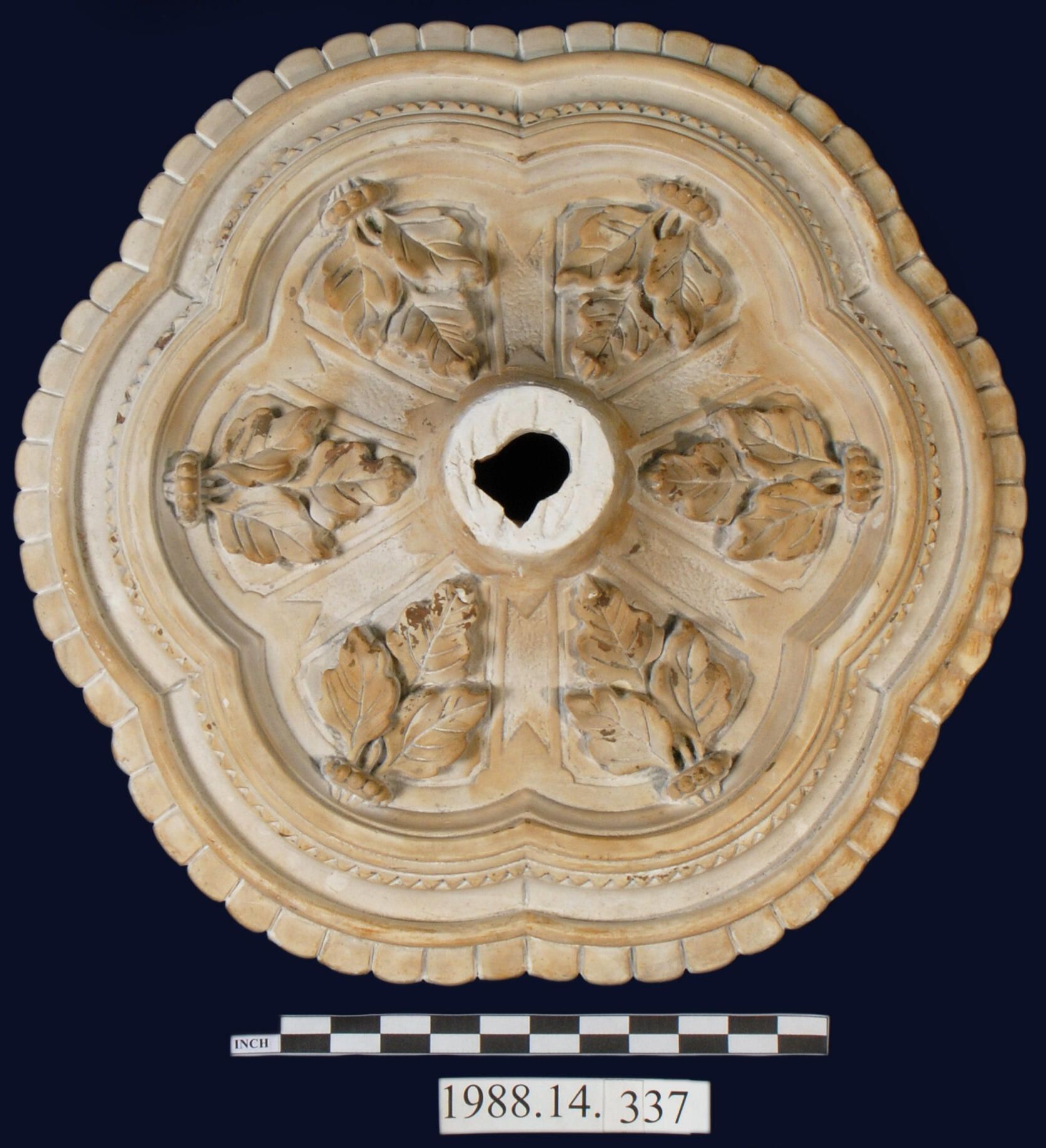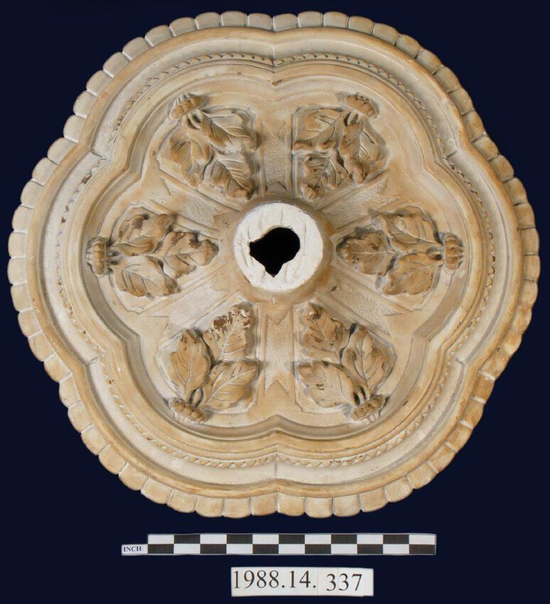 Historic plaster circular ceiling medallion. Central hole. Repeating leaf motif. Scalloped perimeter edge, partially stripped. Has remnants of original paint. Reverse has incised score marks.