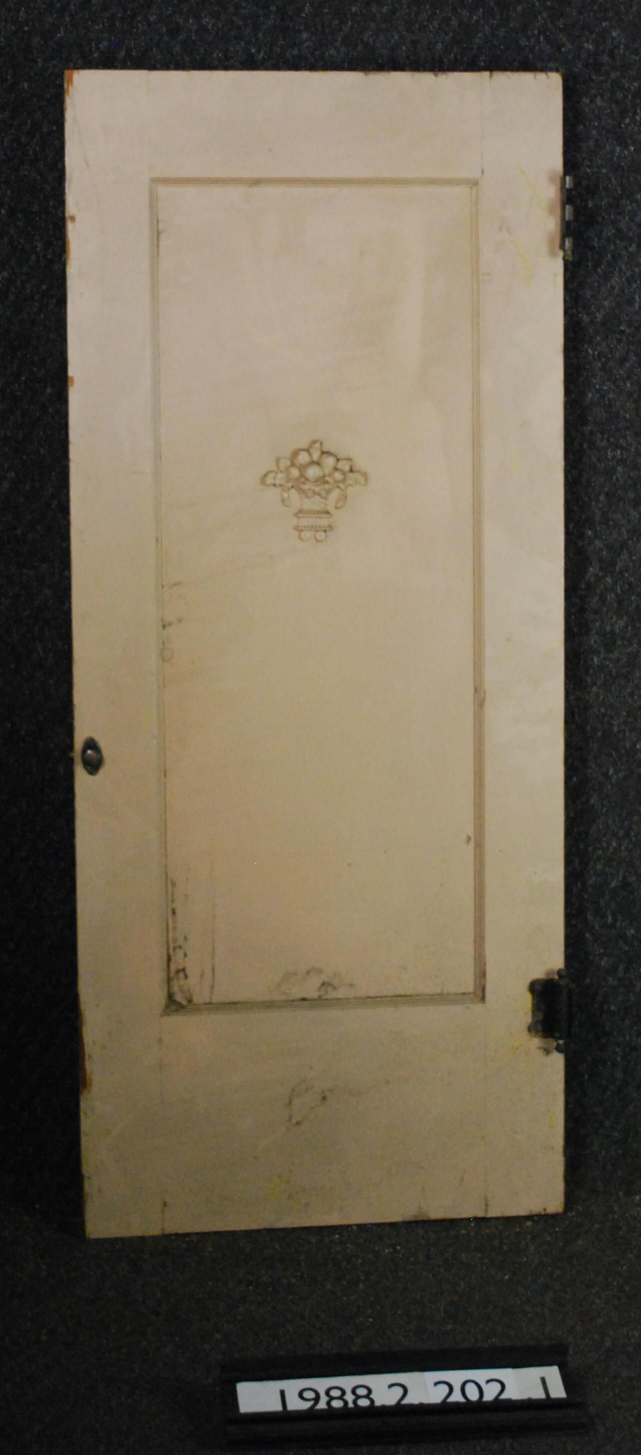 Single plywood panel interior rest room stall door, with applied botanical motif. Reverse has sheet metal panel. Has barrel latch, one spring-hinge, and one hinge leaf. Painted.