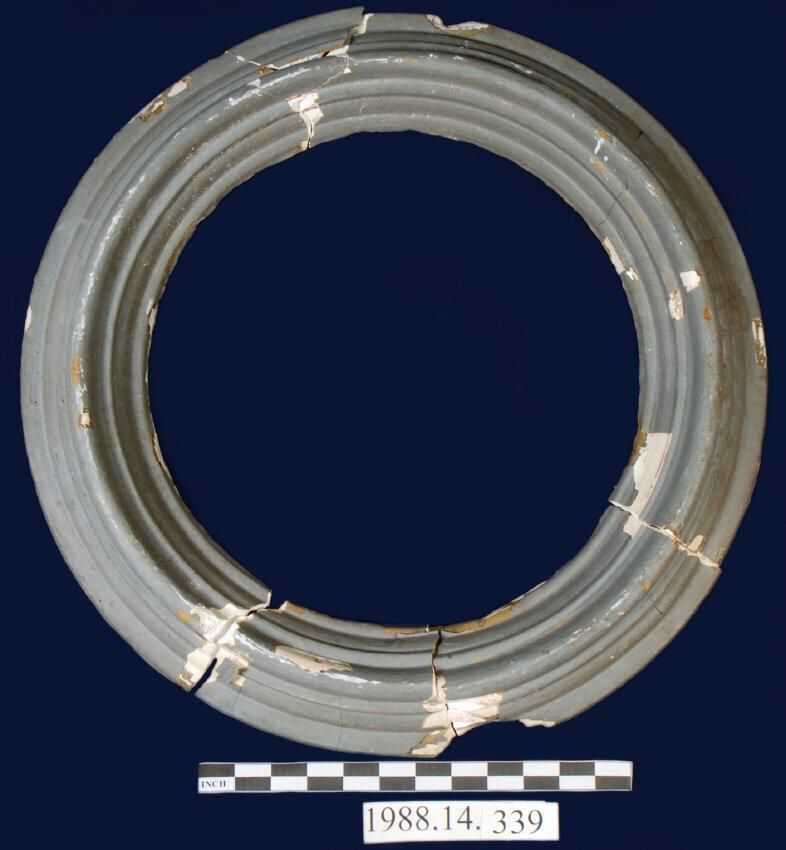 Historic plaster circular ring. Multiple broken pieces. Compound molding profile (concentric ring). Painted dark grey over brown.