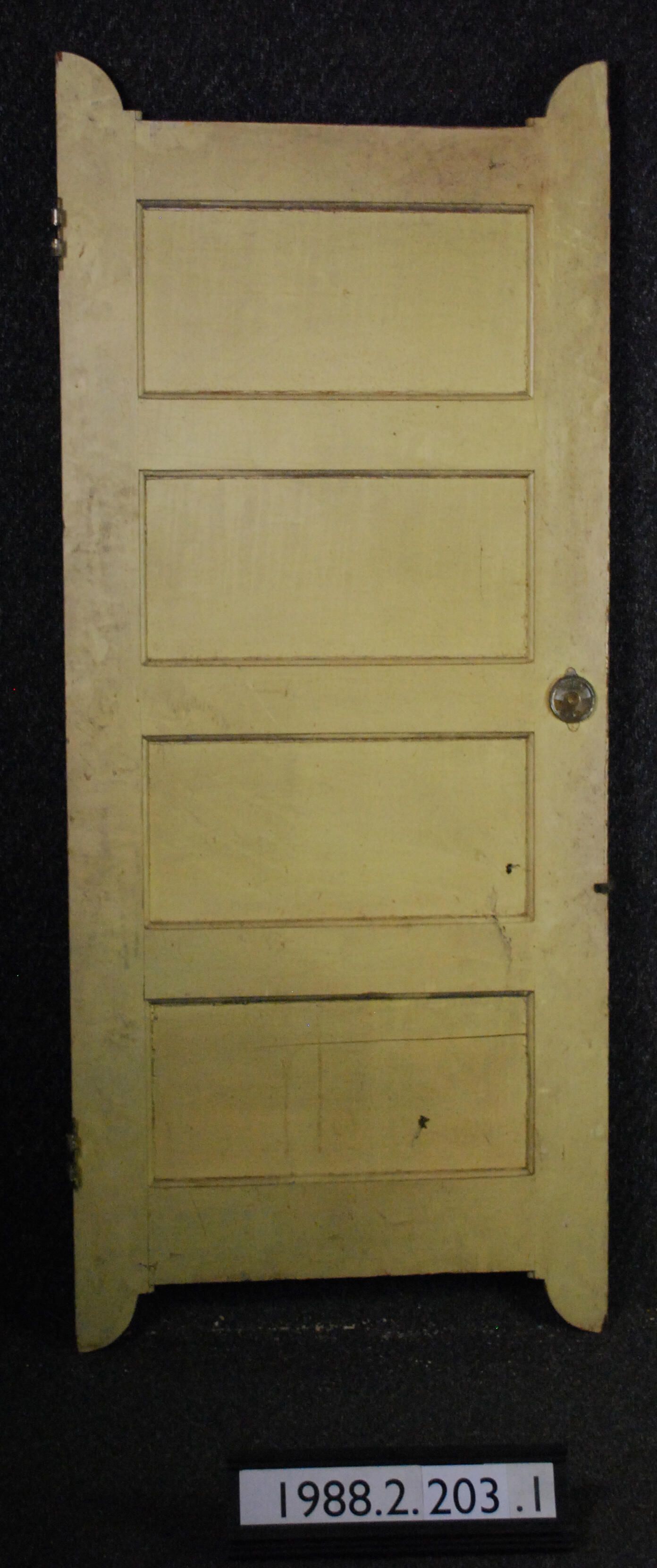 Four panel interior rest room stall door. Has t-handle latch with inscription. Inscription: "Open" and "Occupied." Has two hinge leaves. Painted yellow on both sides. Inscriptions or Markings: "Open" and "Occupied" Manufacturer: Place of Manufacturer: Design Motifs: Style: Finish: Painted Yellow on both sides