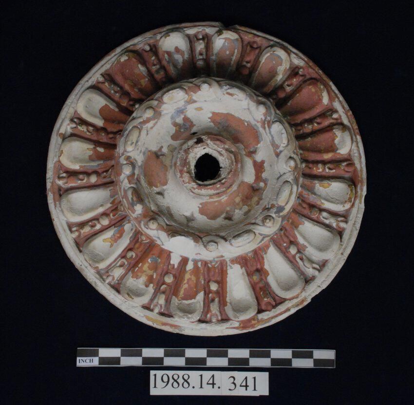 Historic plaster circular ceiling medallion. Central hole. Has twisted link / bead and egg motif. Fluted stylized leaf motif., bead and swag. Painted purple over multiple layers of paint.