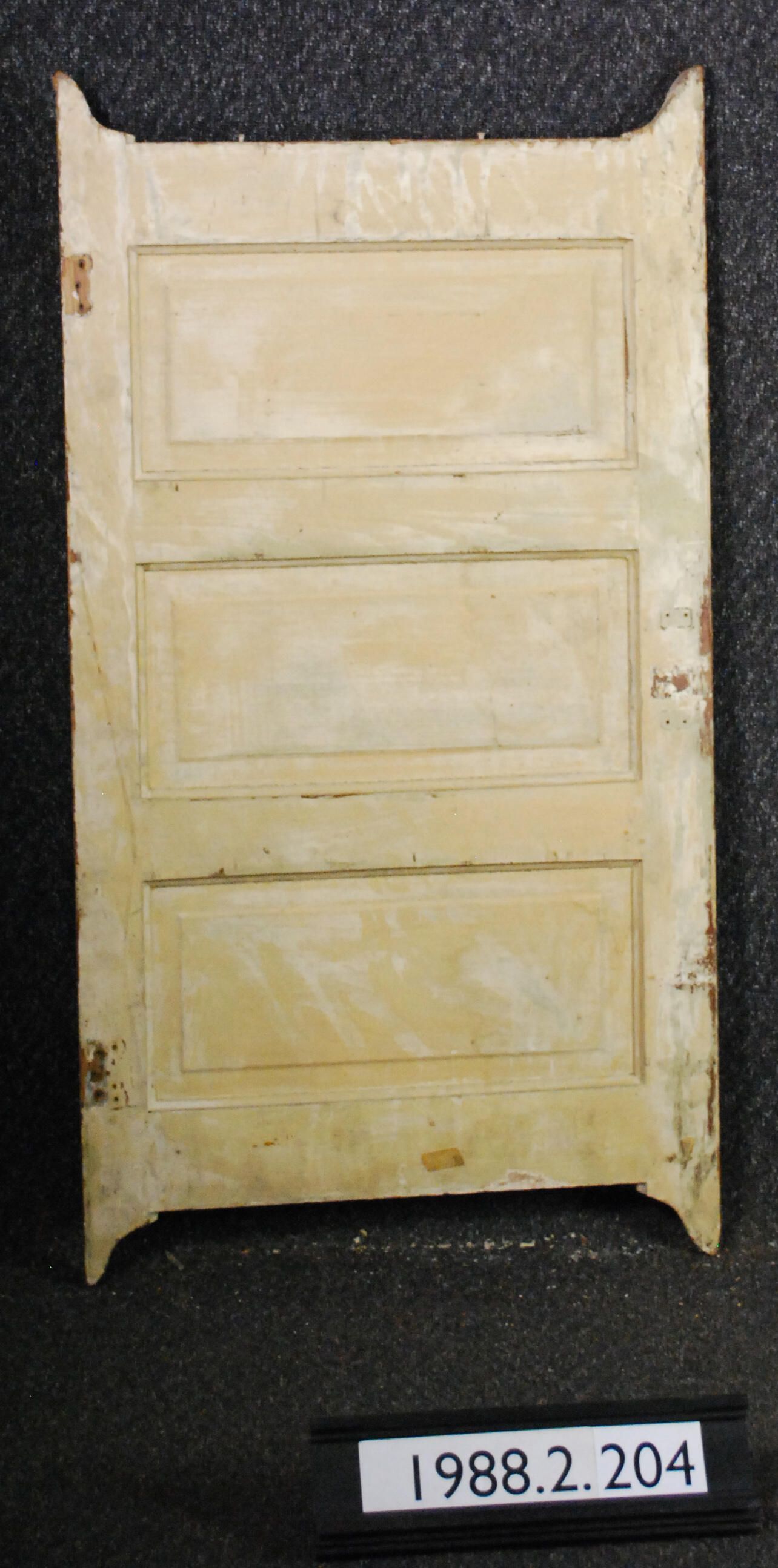Three panel interior rest room stall door. All hardware is missing. Made of cedar, featherweight. Partially stripped with remnants of white and yellow paint.