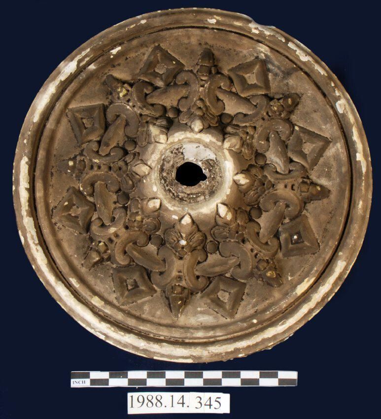 Historic plaster ceiling medallion. Missing center piece. Botanical in center leading to geometric outside. Incised score marks on reverse. Remnant of ceiling, plaster with lath impressions on reverse. Painted: Dirt-encrusted, cream color.