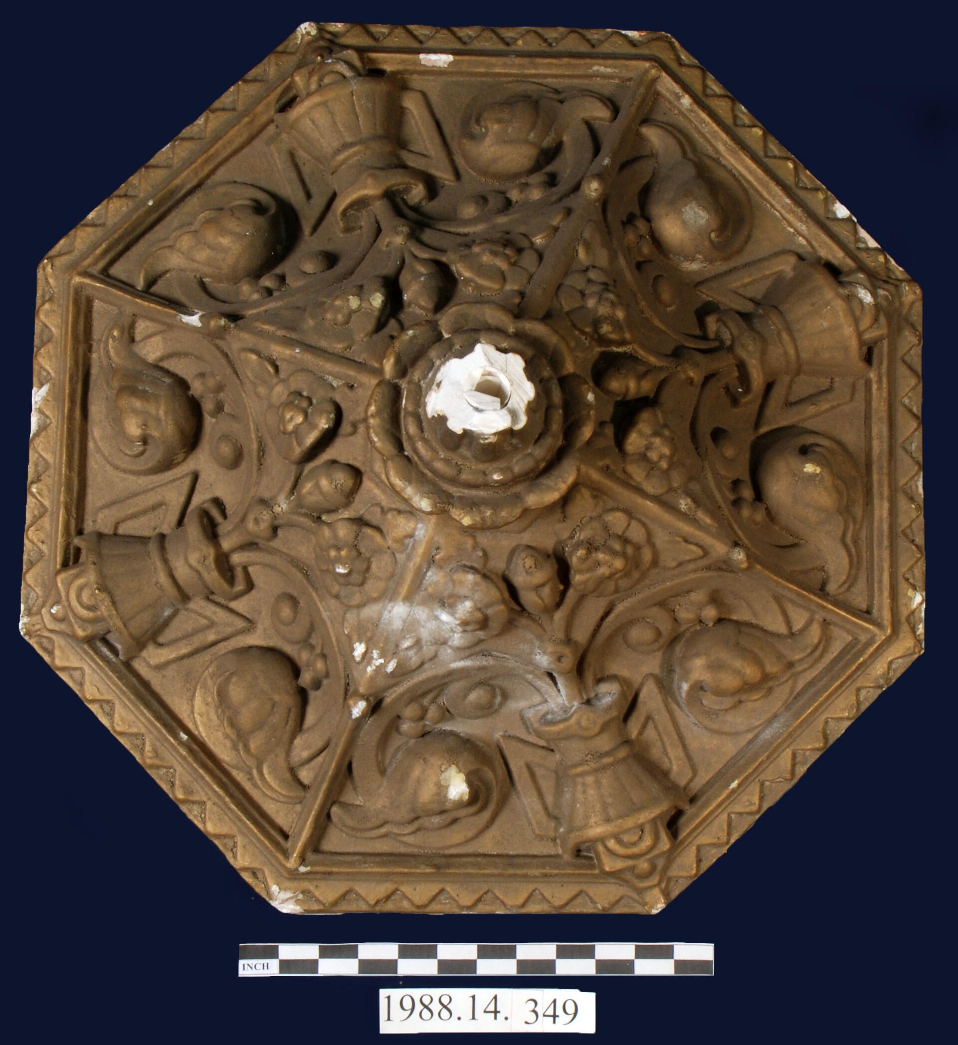 Outer perimeter geometric zig-zag motif. Painted bronze colored, reverse has incised score marks, attached ceiling plaster.