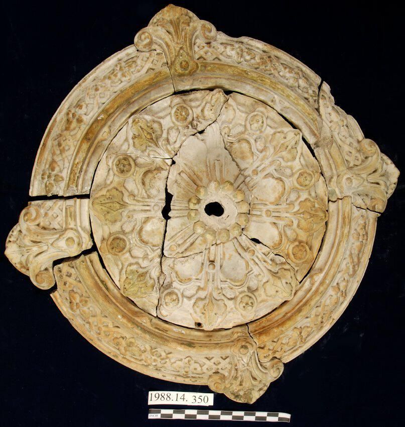 Historic plaster circular ceiling medallion. Central hole. Beaded center piece. Center of medallion is separated from surround. Broken into multiple pieces. Has leaf / scroll and alternating leaf and rosette repeating motif. Outer surround also broken into multiple pieces. Has leaf and scroll appendages and lattice and floral motif. Stripped. Has some remnants of original painted finish.