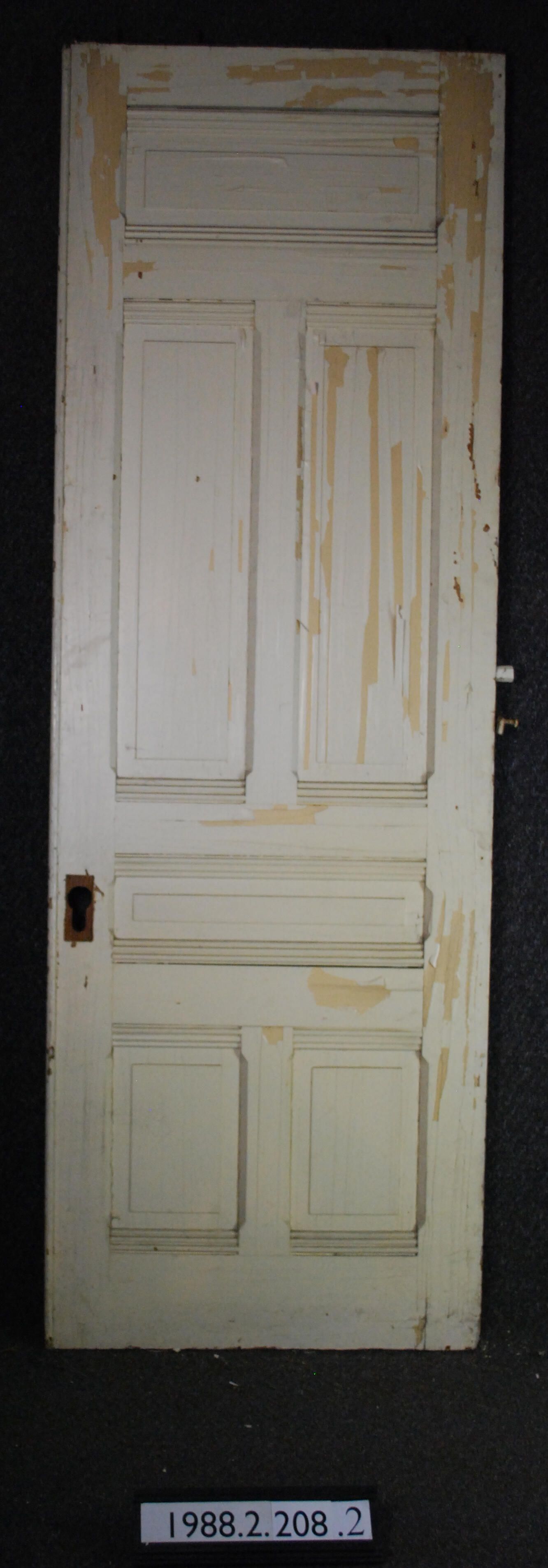 Six panel interior sliding pocket door, with applied moldings and astragal molding along one edge. Hardware missing except for some hanging hardware and a lag bolt on one edge. Painted white on both sides.