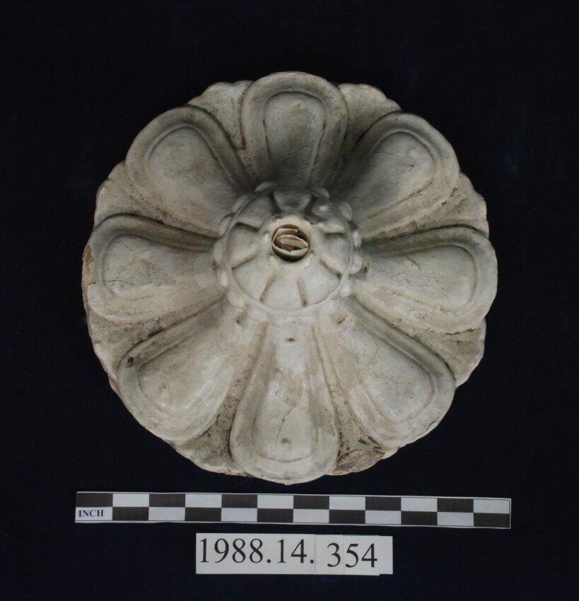 Historic plaster circular ceiling medallion. Has beaded center piece. Central rosette. Outer surround is missing. Same pattern as 1988.14.353. Painted white over multi-layers.