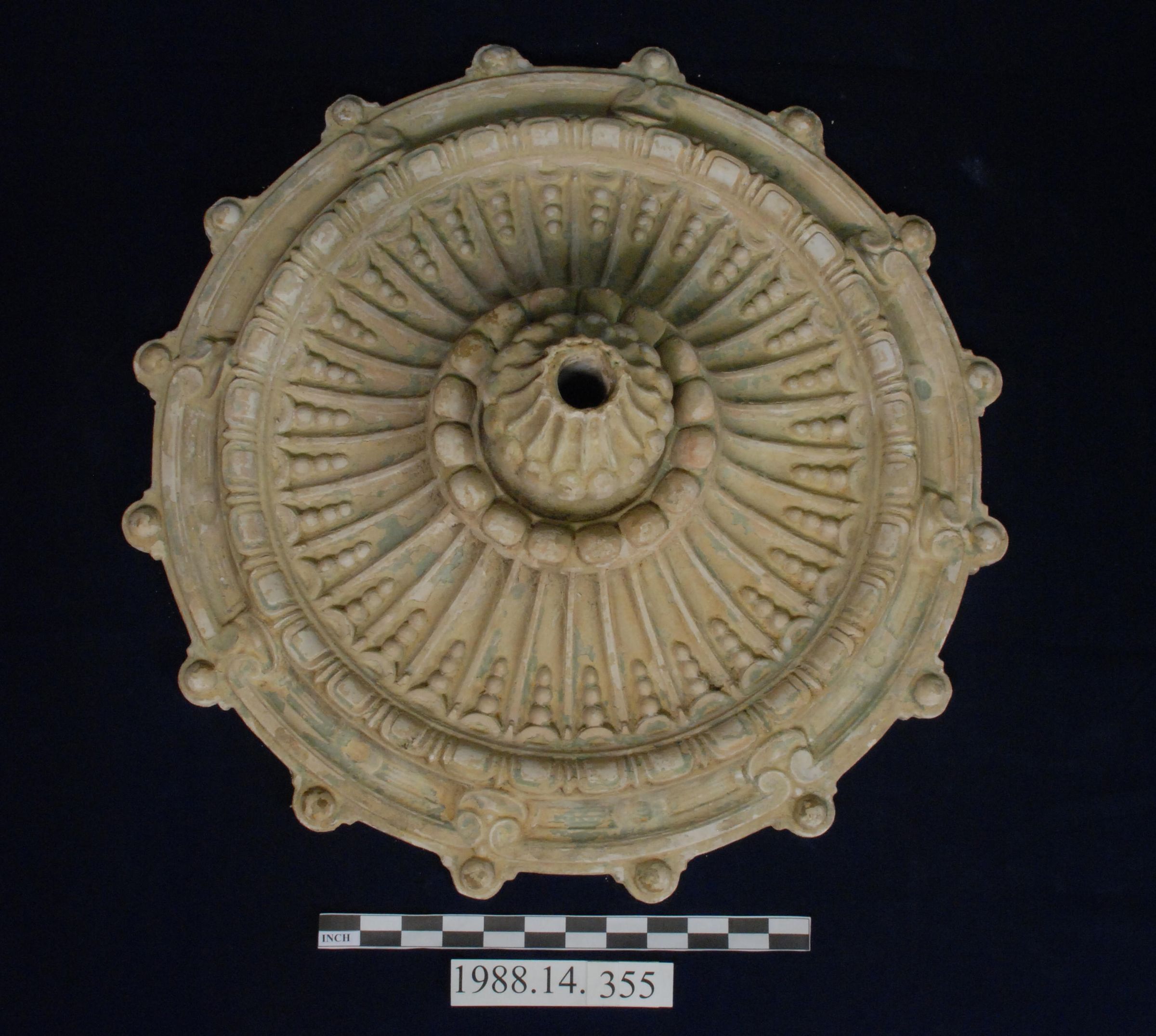 Historic plaster circular ceiling medallion. Central hole. Has centerpiece. Center of medallion has fluting with beading. Modified egg and dart. Perimeter has repeating scroll with bead and projecting appendages. Painted green with yellowish tan.