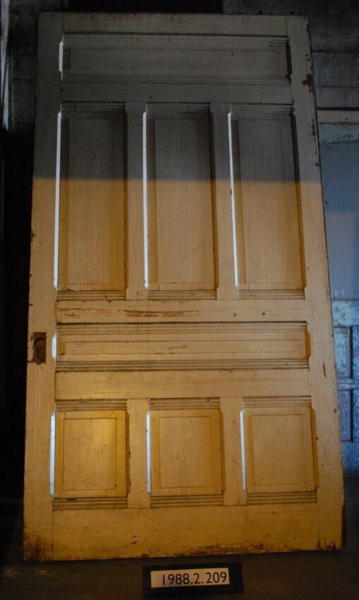 Eight panel interior sliding pocket door, with applied moldings. All hardware missing, except for hanger hardware on top. Painted off-white on both sides.