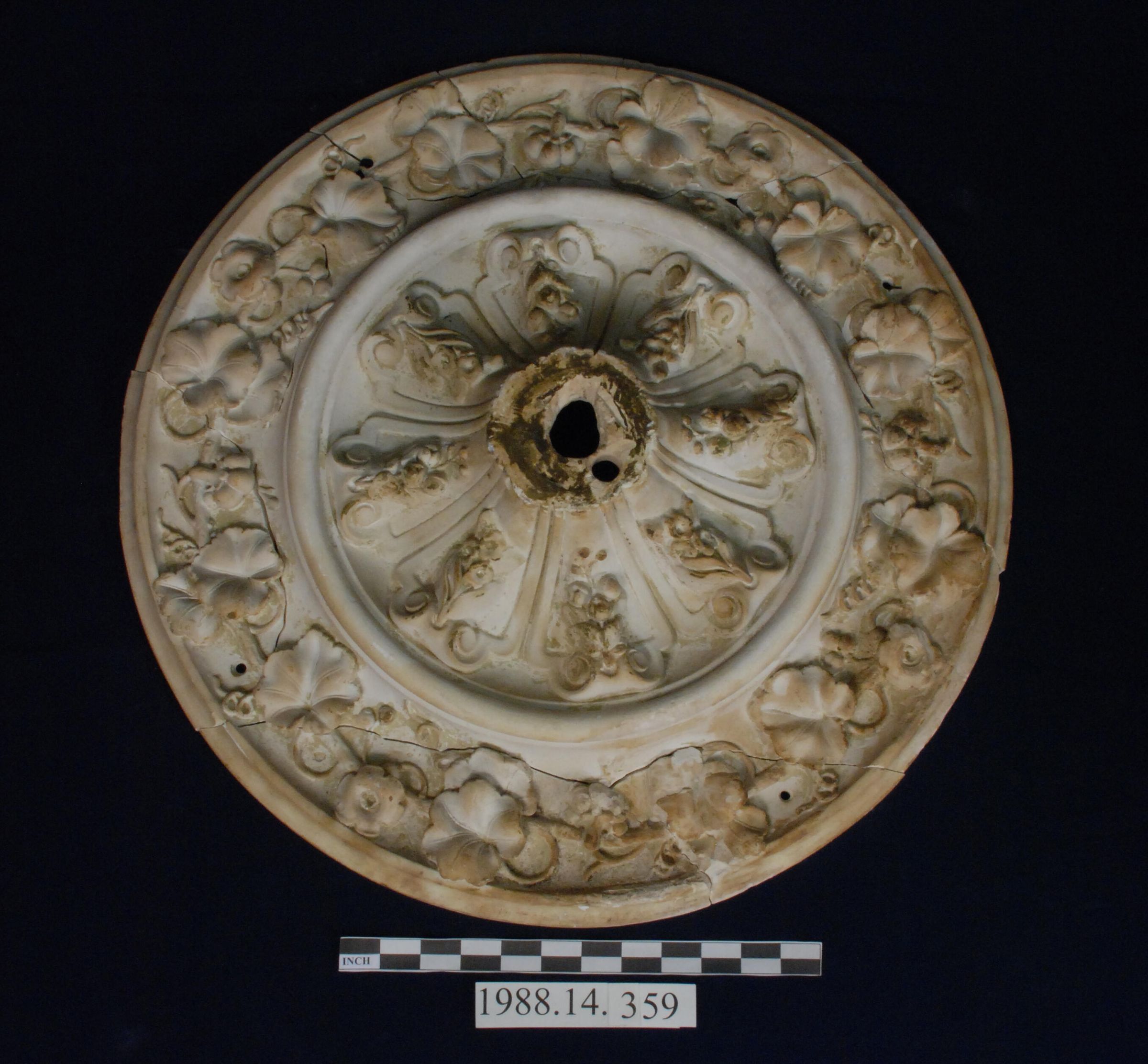 Historic plaster circular ceiling medallion. Alternating floral / leaf positioned on scroll base. Outer perimeter has vine / leaf and blossom motif.