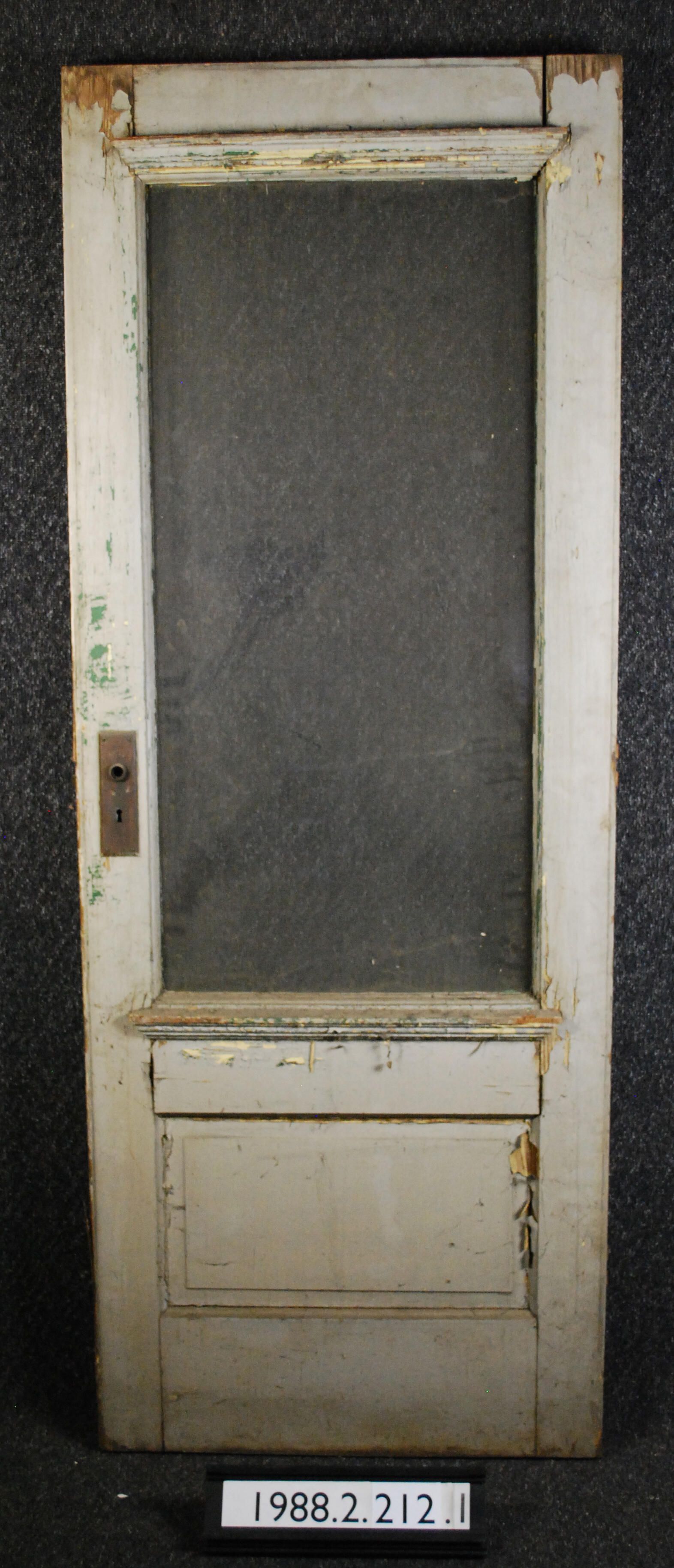 Single panel exterior door Has single sash opening with clear glass pane. Applied moldings on exterior side and below opening. Has mortise lock, two escutcheon plates, and three hinge leaves. Painted grey on one side, and white on the other side.