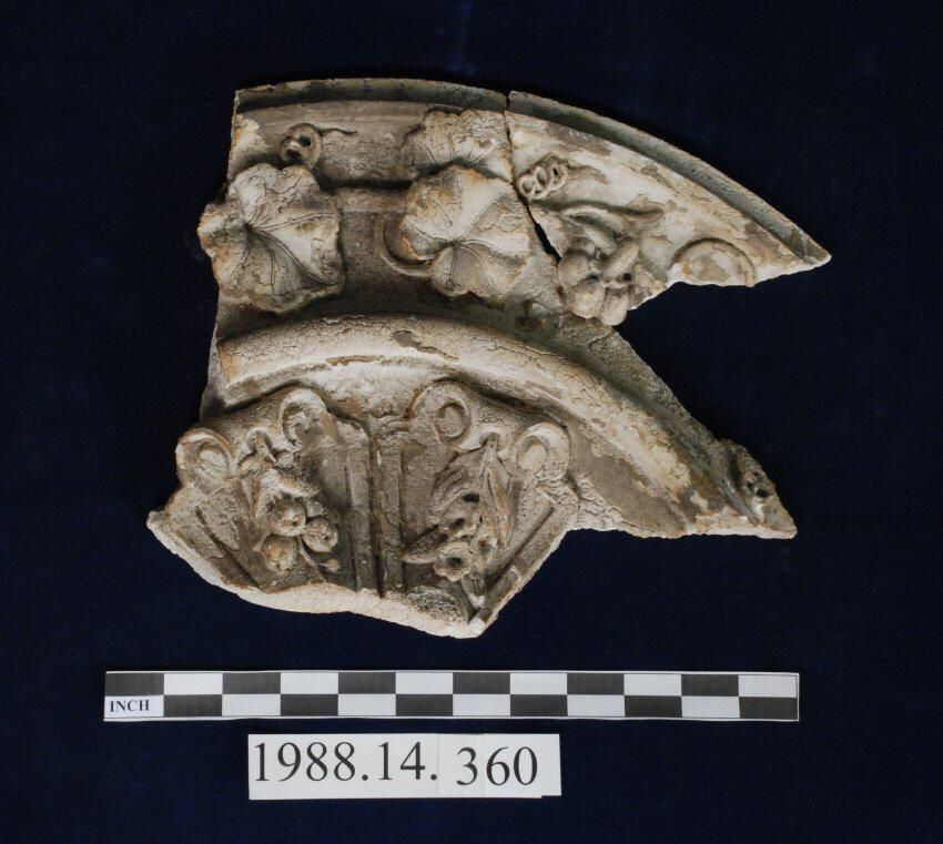 Historic plaster. Two matching fragments of circular ceiling medallion. Floral and leaf patterns positioned on scroll base. Outer perimeter has vine, leaf and blossom motif. Remnant of original paint. See 1988.14.357, 1988.14.358, and 1988.14.359.